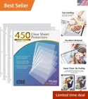 Sheet Protectors x 11 inch Clear Page Protectors for 3 Ring Binder, Plastic Sleeves for Binders, Top Loading Paper Protector Letter Size, 450 Pack Document Protection: Each x inch paper protector can hold x 11 inch letter size paper, 450 pack. 2 sheets of paper can be placed in one pocket. Easy Access Top Loading: Page protectors are for easy top loading, the sleeves are nonstick. Your document is easy to put in the take out, and it is writable for daily use, great for your office and school supplies. Crystal Clear Visibility: The 3 hole sheet protectors are super clear for you to read the document words and images. And Also provide good visibility. The document and photo will not fade, you can store them for a long time. Durable and Sturdy: Made of premium quality polypropylene, PVC free, reinforced edges, fit for standard 3 ring binder. No tear or damage over time. We provide good customer service, any quality issues, please feel free to contact me. Versatile and Practical: The paper protector is ideal for keeping and organizing recipes, photos, important documents, certificates, and music sheets.