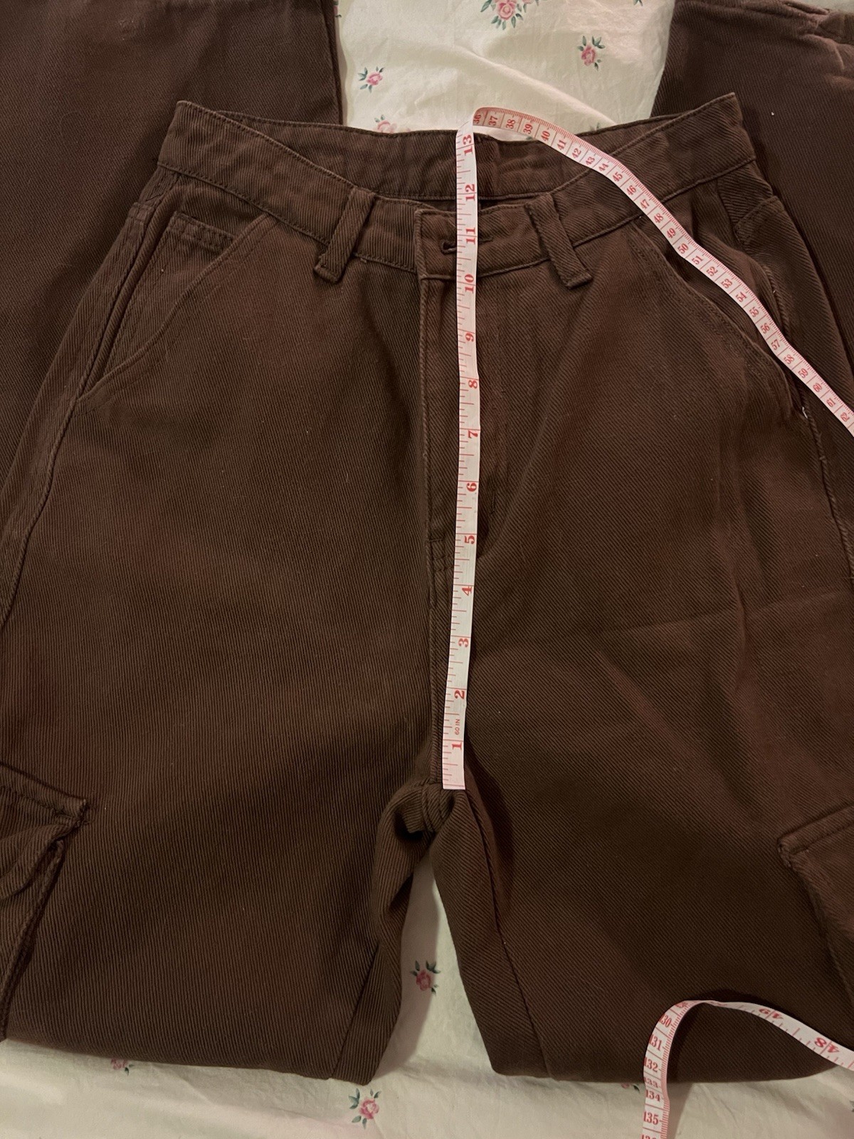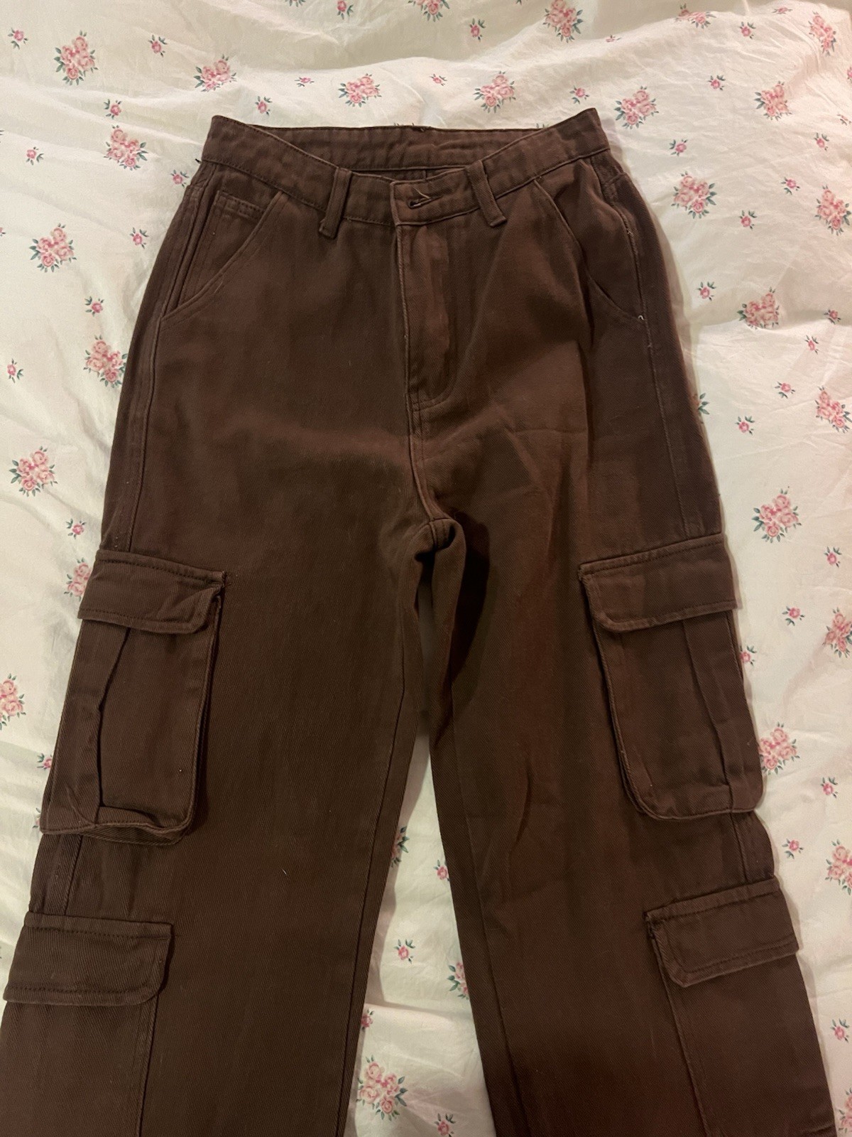 Trendy brown corduroy cargo pants from Shein. High-rise with large utility-style side pockets. Perfect for streetwear or everyday casual looks. Size: Tagged Shein, fits XS/S Condition: Gently used, no flaws