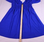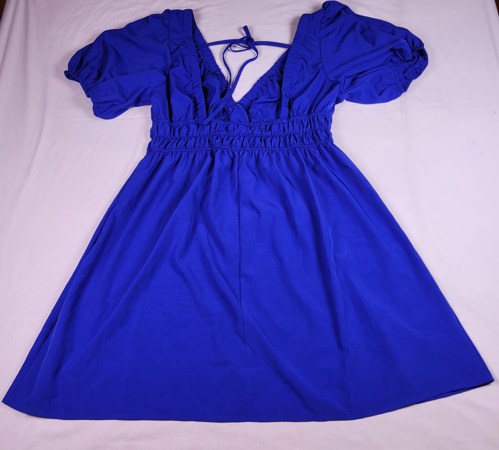 Brand: SHEIN Curve Style: Womens short dress with deep V-neckline front and back, puff short sleeves, elastic ruched waist and tie-back straps. Color: Bright royal blue. Size on tag: 2XL. Material: 100% polyester. Made in China. Details: Pull-on style, gathered bust with ruffle trim, empire waist, flared A-line skirt, unlined.