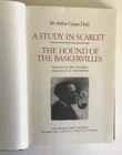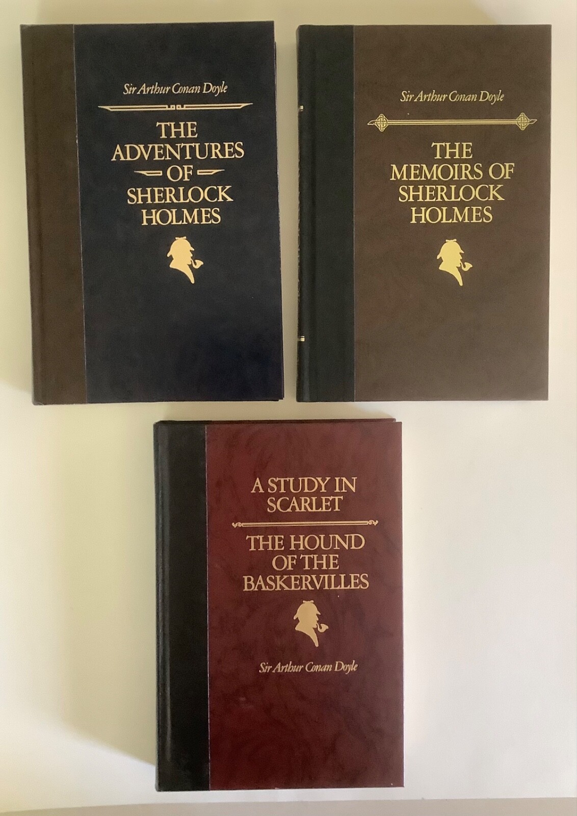 Lot of 3 Sherlock Holmes deluxe illustrated hardcover books by Sir Arthur Conan Doyle: The Adventures of Sherlock Holmes, The Memoirs of Sherlock Holmes, and two novels in one A Study in Scarlet / The Hound of the Baskervilles. All books are in very good condition. Issued by the Reader’s Digest Association as part of their The World’s Best Reading series, two of the book include the publisher’s notes (Adventures and Memoirs). Covers and spines are solid and tight; faux leather spines and marbled covers have gilt lettering and impressions. There is light edge and corner handling wear. The Adventures has a scuff and small mark on the back cover, Study in Scarlett has a small rub at the base of the front cover. There is a book plate inside the front of A Study in Scarlett. No writing found inside the books. See photos. Shipped with USPS Media Mail.