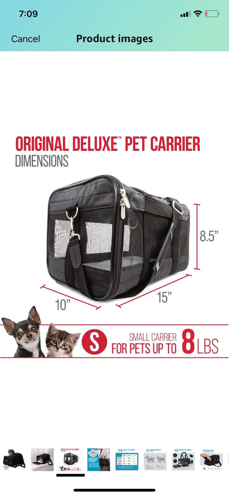 AIRLINE APPROVED: The Sherpa Original Deluxe Pet Carrier is airline approved and part of our Guaranteed On Board program, which provides comfort and peace of mind to pets and their owners; it's perfect for traveling by air, bus, car, or train IN-CABIN FRIENDLY: Our patented spring wire frame allows the rear end of the carrier to be pushed down several inches to easily fit under airplane seats in compliance with most major airline requirements and FAA regulations PERFECT FOR TRAVEL: Features mesh panels for ventilation, escape-proof locking zippers, top and side entries for easy and comfortable loading, waterproof interior base, and a removable machine washable cozy base liner VERSATILE DESIGN: Can be carried by hand with the padded top handle, or over the shoulder using the included detachable carrying strap and integrated metal D-rings - whichever suits your comfort and convenience MULTIFUNCTIONAL: The pet carrier can also be used a soft-sided crate for regular outings and vet visits with cats and small dogs; includes a large storage pocket, and a luggage strap that doubles as a seatbelt security pass-through for car rides PRODUCT DETAILS: Black, Small, 15" x 10" x 8.5"; fits pets up to 8 pounds CHOOSING THE RIGHT SIZE: Choose the perfect carrier size based on your pet's measurements, followed by their weight; make sure not to exceed the maximum weight limit, and allow enough space for your pet to change positions inside the carrier MPN: 076830 Model: 55531 ASIN: B00063433G Size: 15.0"L x 10.0"W x 8.5"H Color: black Dimensions: 15 in (L) x 10 in (W) x 8.5 in (H) Weight: 1 lb