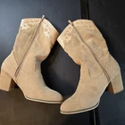 I worn it once. Buy responsibly thank you! The Shibever Women's Embroidered Side Zip Beige Suede Western Boots in size 40 are stylish and versatile boots perfect for various occasions such as travel, weddings, casual outings, and workwear. Featuring a mid-calf shaft style, round toe shape, and pull-on closure, these boots also have embroidered accents and a block heel for added charm. Made with a blended fabric upper and leather outsole, these Western-themed boots with tassels are a great addition to your wardrobe, suitable for all seasons.