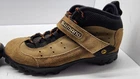 This is a pair of Shimano SH-M057 women's cycling shoes in size 10, perfect for any mountain biker. The shoes are made of high-quality suede material and come with a stylish beige color. Designed with a high-top shaft style, these sneakers provide extra support and protection during cycling. The shoe's brand, Shimano, is known for its exceptional performance and activity during cycling. These shoes are specifically designed for mountain biking and therefore come with great features to enhance cycling. The shoes are pre-owned and in excellent condition. Get these shoes and enjoy your cycling experience. These are in great shape for being used. There is alot of life left in these to have many days of fun.