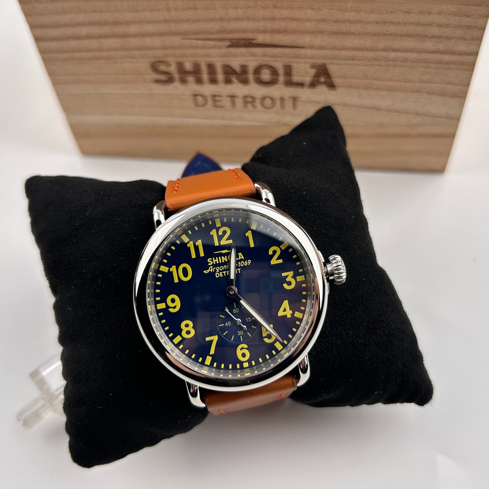 Watch details: Brand: Shinola Collection:Runwell Crystal: Double-domed sapphire Dial Color:Blue/Silver Type: Argonite 1069 Quartz Water Resistance: 5 ATM Crown Construction: Screw-down Case Material: Stainless Steel Case Diameter:47 mm Back:Signature Iconic Caseback Plate with Laser-Etched Serial Number Band Width: 24mm Band Color: Brown Thickness: 11mm Band Material:Leather Plating:Polished PVD Gold THE ARGONITE 1069 The first movement we learned to build and the one that still exudes an understated power. The high-accuracy quartz movement—hand-assembled in Detroit with Swiss and other imported parts—drives the hours, minutes and sub-second with precision. POLISHED STAINLESS STEEL CASE This polished stainless steel case features a classic pumpkin crown and double-domed sapphire crystal. Sapphire is second only to the diamond in hardness, helping protect the watch from scratches. COLLEGIATE BLUE DIAL The face of fandom, this eye-catching dial pairs collegiate blue with maize details for a look that’s tough to beat. PREMIUM LEATHER STRAP IN NATURAL Smooth and sophisticated, this premium leather strap in natural is the perfect complement to this Runwell. It's also removable, making the timepiece customizable with the purchase of an additional strap. Shinola leather straps are cut and sewn in America. A WOODEN BOX TO TREASURE Built from premium wood, every Shinola watch box is designed to last for generations. Fast shipping via usps, ups, fedex Orders will ship within 1-2 days (excluding weekends and holidays) Please contact me if you have any questions, and I will reply within 24 hours.