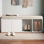 Shoe Storage Bench with PU Leather Cushion, 47.24" Shoe Cabinet with 2 Doors & 2 Storage Cabinets for Entryway, Hallway, Living Room, White 【Soft PU Leather Cushion】: The top cushion is made of premium PU leather that feels soft and smooth to the touch. It is breathable, skin-friendly, and easy to clean. Filled with a high-resilience sponge and cotton, it provides exceptional comfort whether you're putting on shoes or taking a moment to relax. 【Spacious Double Cabinet Design】: Designed with two door-style cabinets and two roomy storage compartments, this shoe bench keeps footwear and everyday items out of sight. Perfect for storing shoes, bags, or seasonal accessories, it helps keep your entryway tidy and well-organized. 【Durable Engineered Wood Structure】: Built with high-quality engineered wood, the bench ensures reliable sturdiness and long-term use. The frame is solid and doesn’t shake or wobble—perfect for daily seating. It can easily support adult weight and frequent use. 【Easy Assembly】: No professional tools needed. This bench comes with clear assembly instructions and all required hardware, so you can put it together quickly and hassle-free. Ideal for anyone who wants a fast and convenient setup. 【Excellent Customer Service】: We are committed to providing high-quality service. If you encounter any issues with the product, we promise to solve them promptly and efficiently. Your satisfaction is our top priority, and we will go the extra mile to ensure you are happy with your purchase. Packing Includes: 1 x Shoe Bench 1 x Assemble Instruction 1 x Accessories required for assembly