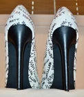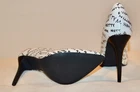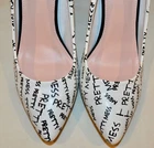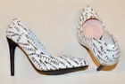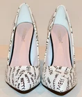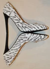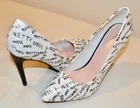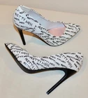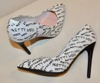 Shoedazzle's Pretty Mess Classic Stiletto Pump Size: US 11 M / EU 42 Color: White with Black "Pretty Mess" Text throughout. Heel Height: 4 ¾ Inch (120mm) No Platform New Without Box Condition. These fabulous pumps are new and unworn with one minor flaw. There is a pin-head sized dent in the heel of the right shoe. See pics 13 & 14 for a close-up view. No wear to the soles or heel taps. See all 23 photos for the best idea of the overall condition and the pin-head dent mentioned above. Feel Beautiful! Please do not hesitate to use the EBay messaging system with any questions. It is time to think about holiday gift giving. What a wonderful surprise this would be for that someone special or just for you! Buy it NOW! All of my sales are PRIVATE, (your ID cannot be seen by other buyers), so purchase with confidence and anonymity. We cater to Everyone! Indulge yourself or a loved one with a beautiful gift of fashion and sophistication. All my items come from a SMOKE FREE home. I have a 30 day RETURN POLICY. I always provide a detailed description with sizing information and lots of pictures. If for some reason you feel I have misrepresented an item, please contact me and I will do what it takes to resolve the problem. Please ask any questions you may have prior to buying. Payment is made at the time of purchase. Shipping is $9.49 to US addresses and includes USPS Priority Shipping, $50.00 Insurance, Delivery Confirmation and a USPS Tracking number . INTERNATIONAL SHIPPING charges will be higher than US domestic shipping charges. Please ask for shipping quote before purchasing. Shipping will be based on US Postal service rates to your country and will be quoted at checkout. Please let me know if you are buying multiple items and I will send a consolidated invoice with a combined shipping charge for your entire purchase. MOST ITEMS SHIPPED WITHIN 24 HOURS OF PAYMENT! Happy EBaying! Now for the legal stuff………the shoes pictured are the shoes you will receive, if, you are the high bidder. The photographs are intended to show close-up details of the item listed and how it will look, if worn. No other intent is implied or specified. My words, descriptions and photos may not be copied or reproduced without my express consent.