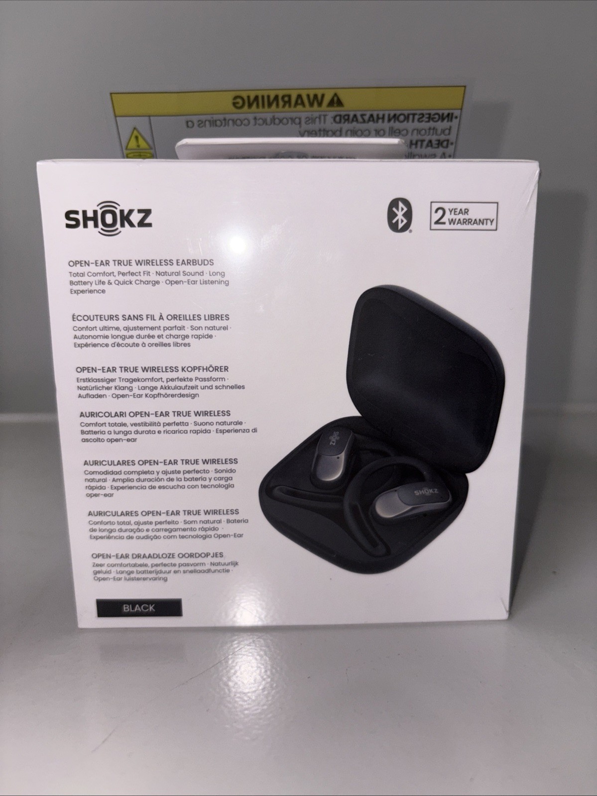 The Shokz OpenFit Air True Wireless Bluetooth Headphones in Black offer a sleek and comfortable design with a built-in microphone for convenience. These headphones feature true wireless technology and are water-resistant, making them perfect for workouts or on-the-go use. The included charger ensures you always have power on hand, and the USB connectivity allows for easy charging. With the trusted Shokz brand and high-quality features, these headphones are a great choice for anyone looking for a reliable and stylish audio solution.