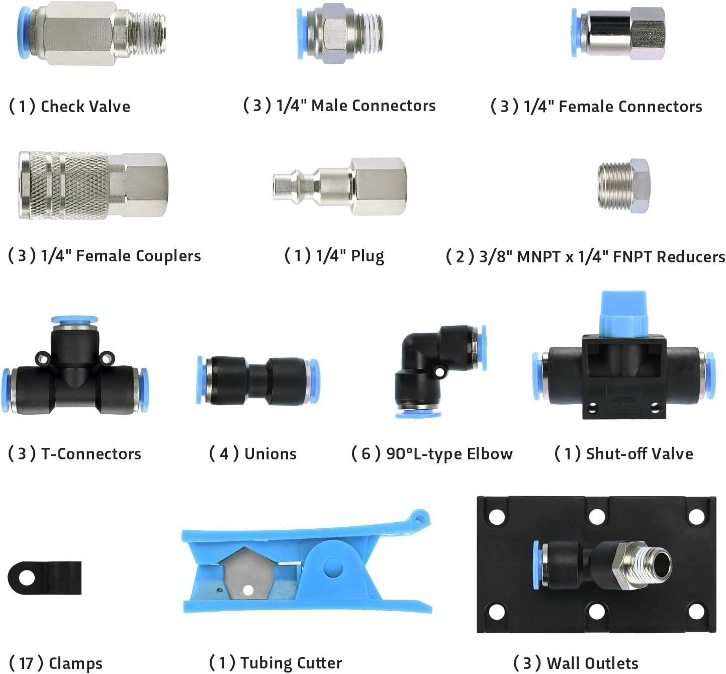 Store New Arrivals Add to Favorite View Feedback Contact Shop Air Line Kit, 3/8 Inch (9.5MM) OD × 60 Feet Nylon Compressed Air Pipe, 200PSI, Cutter, Tees, Mounting Clips, Connectors, 49PCS Garage Air Compressor Accessories Master Kit Description Nominal Wall Thickness 0.035 inches Part Number TH1043S Batteries Required? No Item Package Quantity 1 Maximum Pressure 800 Pound per Square Inch Color Blue/Red Material nylon plastic steel Item Weight 1 Pounds Batteries Included? No Item Length 60 Feet Outside Diameter 0.38 Inches Item model number TH1043S Product Dimensions 720"L x 0.37"W Number Of Pieces 49 This kit is designed for high-demand air tool users and longer air line runs in the home garages or shop. Different type of connector allows you to design and install your air line. 3/8 Inch ×60 Feet nylon tubing has the advantage of being noncorrosive, ageing-resistant, with mirror smooth finish and easy to be assembled, the Max Working Pressure is 200PSI and the Bursting Pressure is 800PSI. Cutting tool is included for preparing tubing. Connectors include 3pcs T-connectors, 4pcs unions, 6pcs 90° L-type Elbow, 1pc shut-off valve, 3pcs wall outlets, 1pc check valve, 3pcs 1/4 Inch NPT male connectors, 3pcs 1/4 Inch NPT female connectors,3pcs 1/4 Inch NPT female coupler, 1/4 Inch NPT female plug, 2pcs 3/8 Inch MNPT × 1/4 Inch FNPT Reducers, 17pcs Clamps. Note: Tubing and connector must be assembled in place, or it maybe cause air leakage, When connected, press down the blue release ring, then push the hose to the connectors. Do not push hose to connectors directly. And need to cut the end of hose if the first connection isn't in place, all metal fittings threads need seal tape to avoid air leakage. WYNNsky air line kit is designed for high-demand air tool users, different type connections allow customer to design and install your own personalized air system any way you want, which included 3/8 Inch ×60 Feet nylon tubing, T-connectors, unions, 90° L-type Elbow, shut-off valve, wall outlets, check valve, 1/4 Inch NPT male connectors, 1/4 Inch NPT female connectors, 1/4 Inch NPT female coupler, Inch NPT female plug, 3/8 Inch MNPT × 1/4 Inch FNPT Reducers, Clamps, tubing cutter Product description We are WYNNsky, professional air compressor accessories manufacturers and sellers. and what does this mean to you as a customer? This means you can buy with confidence knowing you will receive a brand-new product. Your product will come in its original packaging with all hardware, accessories, manuals, and instructions included by WYNNsky. As an perfessional seller, we can ensure that all requirements have been met for the products we carry. When you buy from us, you can rest assured your product is free from defects. Customer is always our top priority & we are standing by ready to provide you with reliable technical assistance with any questions you may have. WYNNsky Air Line System Kit WYNNsky air line kit is designed for high-demand air tool users, different type connections allow customer to design and install your own personalized air system any way you want, which included 3/8 Inch ×60 Feet nylon tubing, 3pcs T-connectors, 4pcs unions, 6pcs 90° L-type Elbow, 1pc shut-off valve, 3pcs wall outlets, 1pc check valve, 3pcs 1/4 Inch NPT male connectors, 3pcs 1/4 Inch NPT female connectors,3pcs 1/4 Inch NPT female coupler, 1/4 Inch NPT female plug, 2pcs 3/8 Inch MNPT × 1/4 Inch FNPT Reducers, 17pcs Clamps, 1ps tubing cutter How To Build Your Own Air Pipe System STEP ONE First, need to design your air pipe system for your garage or shop, Then, according to the actual requirements, cut the pipe of the appropriate length with the cutter which Included in the suit. STEP TWO When connected, press down the blue release ring, then push the hose to the connectors. Do not push hose to connectors directly. And need to cut the end of hose if the first connection isn't in place. STEP THREE This kit covers many connection, flexible use of these connectors according to actual requirements, Customer can purchase additional fittings to customize your air line installation if If there are not enough connectors STEP FOUR These are 17 Clamps and 3 wall outlets which help fix the pipe, wall outlets can be connected with work station. ABOUT US We offer the best prices around on high quality products. Our E-store includes media such as books, movies, music and games while offering electronics, toys, sporting apparel, clothing, tools, general home, garden items and more. SHIPPING We are always working hard to ensure your package arrives as soon as possible. Please understand that some factors like weather, high postal traffic, and the performance of shipping companies are outside of our control. We offer free shipping to the lower 48 states and ship within 2 business days of payment, usually sooner. We do not accept P.O. Boxes. Please provide a physical address. For shipping outside of the continental USA, we only use eBay's Global Shipping Program.The item is shipped to KY and then sent to the rest of the world. International customers are responsible for all duties and taxes. Continue to check out in order to calculate costs for shipping the item to your country. Messages regarding eBay's Global Shipping Program MUST be directed at eBay EXCLUSIVELY. RETURNS We offer a 30-Day Return Policy on items which you are not completely satisfied with. You have the option for a full-refund or an exchange of the item. No returns are available on items shipped outside of the USA. PAYMENT We accept PayPal. CONTACT US This page content is yet to come Please ad us to your favorite seller and visit again later Thank You CUSTOMER SATISFACTION We try our very best to make sure every customer is completely satisfied. If there's a problem, message us! We're happy to help. WE ACCEPT Copyright © 2021 AutoDS. | All Rights Reserved