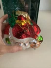 Short And Stout Glass Santa Ornament With Reindeer. This adorable glass ornament features a short and fat round Santa with a cute reindeer standing next to him. He has a basket of goodies on his back. He is approx 5” tall, 5” wide and 5” deep. Comes with the box.