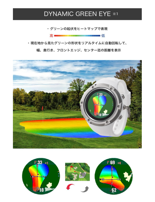About this product First, please change the language setting to match your country. This product is equipped with the latest GPS chip "U-blox M10". In addition to the MICHIBIKI satellite, GLONASS and Galileo are also supported, enabling more accurate measurements than conventional products. 1.2-inch MIP LCD SHARP's 1.2-inch MIP LCD is used. Memory In Pixel (MIP) color reflective LCD" for clear screen visibility even under the sun. Dynamic Green Eye Displays a heat map of the undulations of the greens. The shape of the green as seen from the current location is automatically rotated in real time, and the width, depth, front edge, and distance to the center are also displayed at the same time. Auto Measure (automatic distance measurement) Automatically detects your swing and measures and records the distance for you. Fairway Navi All at once, the distance from your current location to the center of the fairway in the direction you want to hit and the distance from there to the green, such as over dock wrecks and trees, or recovering from a trouble shot. The system supports you in deciding how to attack the green from your current location. Real Distance Display Guides you not only the straight line distance to the green, but also the distance you actually have to hit the ball from now on. Aim function This function assists you in correctly addressing the target you are aiming for. Approximate height difference distance The distance of the elevation difference is displayed and the distance is displayed taking the difference in elevation into account. Competition Mode Compatible with the new rules for 2019. Can be used in competitions. The prohibited functions are hidden when in competition mode, allowing for use in competitions. Made in Japan All processes, including mounting, assembly, and inspection, are performed at our own factory in Japan.