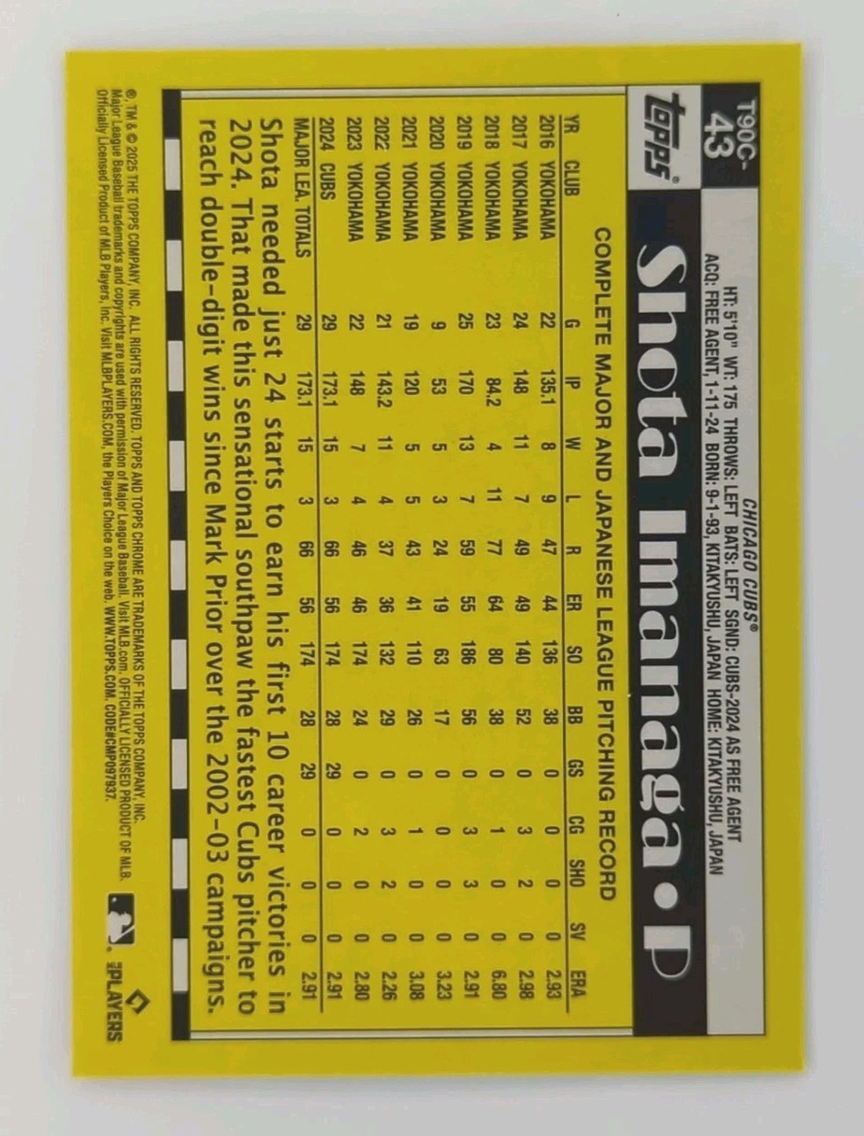 The Shota Imanaga 2025 Topps Series 1 Silver Pack Mojo Refractor Parallel T90C-43 is a highly sought-after baseball trading card featuring the player from the Chicago Cubs. This exclusive card is a part of the 2025 Topps set and is known for its Mojo Refractor parallel variety, making it a unique addition to any sports trading card collection. Manufactured by Topps, this card is a box topper insert that is sure to be a standout piece for fans and collectors alike.