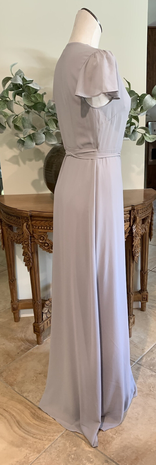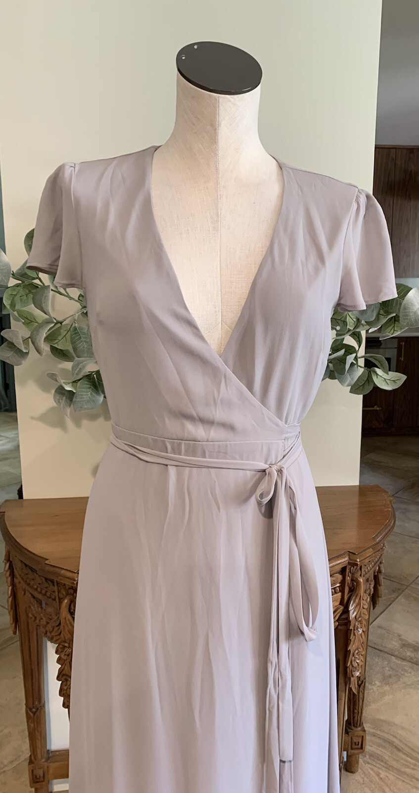Make a statement in this beautiful Show Me Your MuMu wrap dress. The flutter short sleeves and v-neckline add an elegant touch to the dress, while the tie closure cinches at the waist to create a flattering shape. The dress is made of high-quality polyester material and features a solid gray color, making it perfect for a wide range of occasions such as weddings, parties, and formal events. The long dress length adds a touch of sophistication and pairs well with any season, be it summer, fall or spring. The dress is available in XS size and is suitable for regular women. In excellent condition like new Bust 16” Length 60” N4FG47