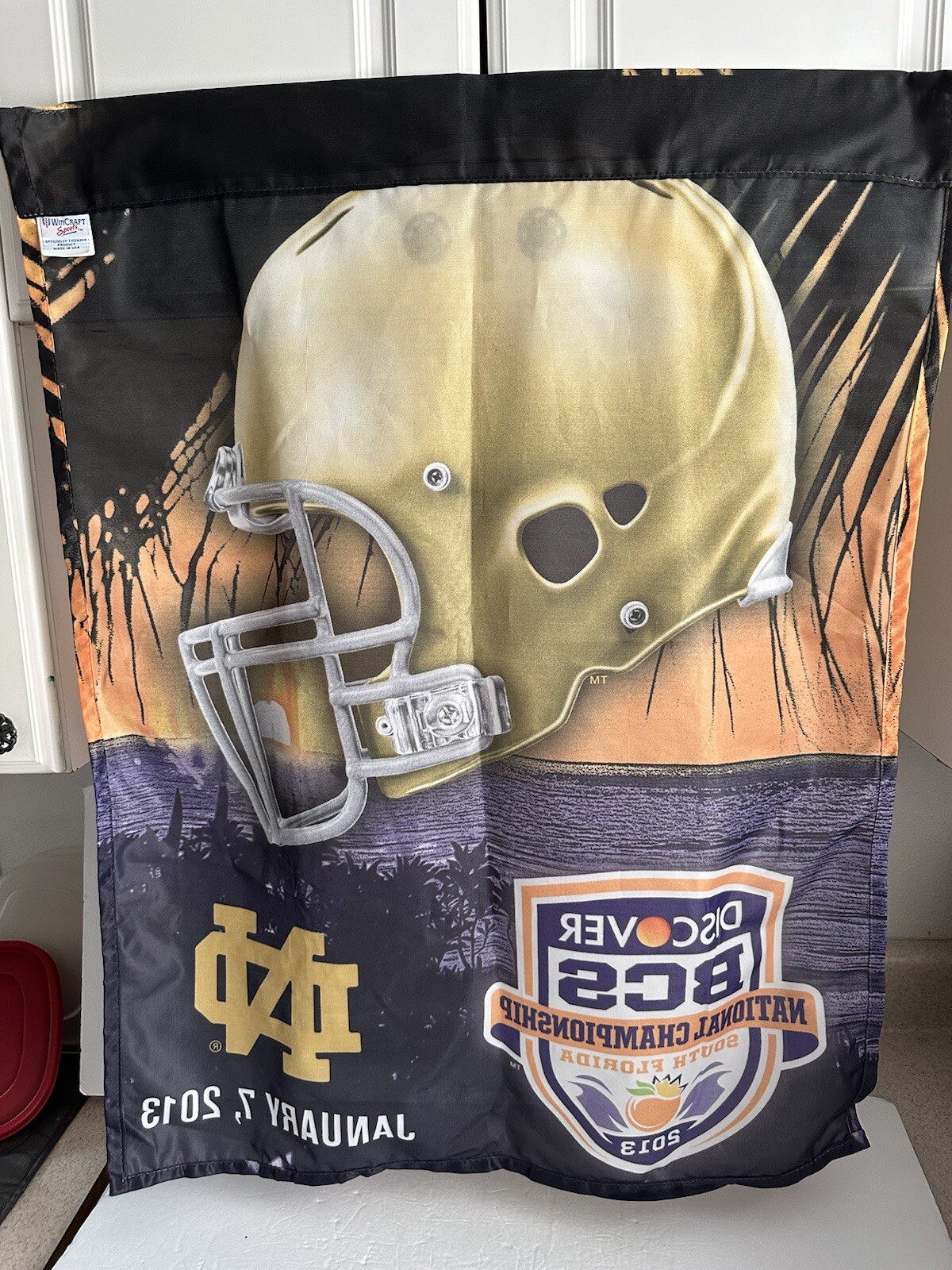 This product is a used vertical flag features the University of Notre Dame Fighting Irish. The flag was made by WinCraft and commemorates the team's 2013 BCS National Championship win. It falls under the categories of Sports Mem, Cards & Fan Shop and Fan Apparel & Souvenirs for College-NCAA.
