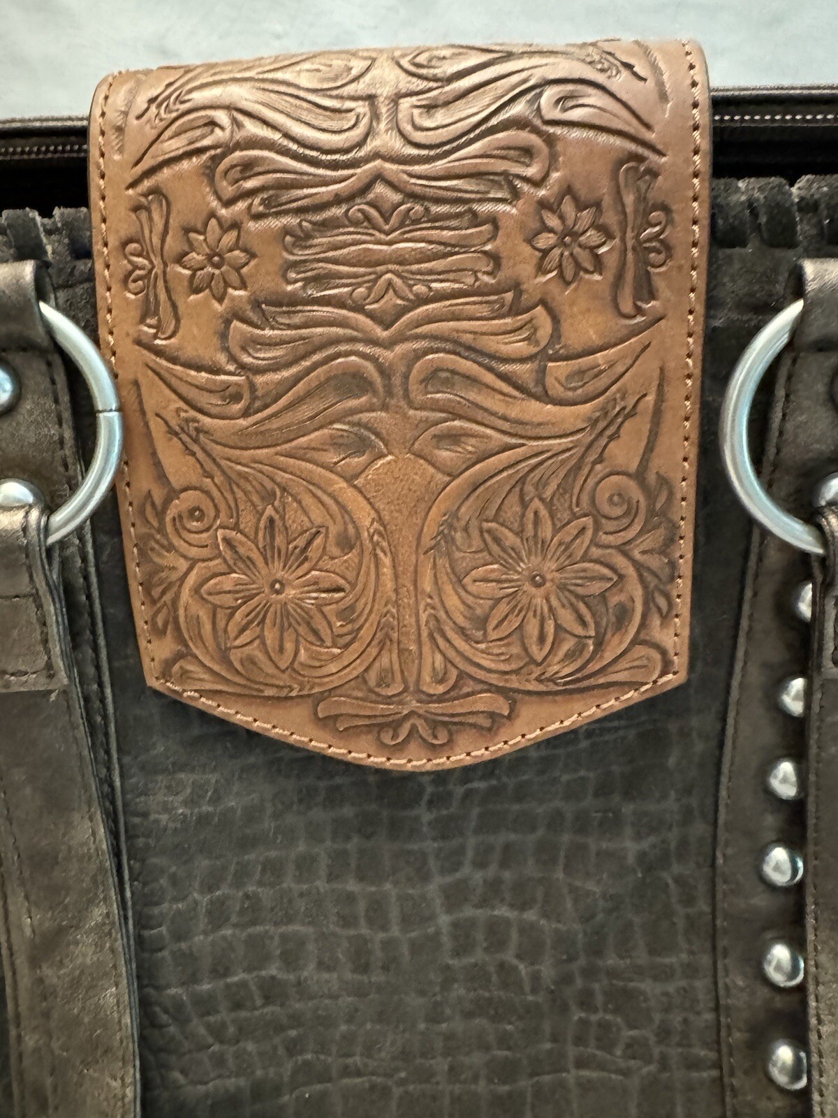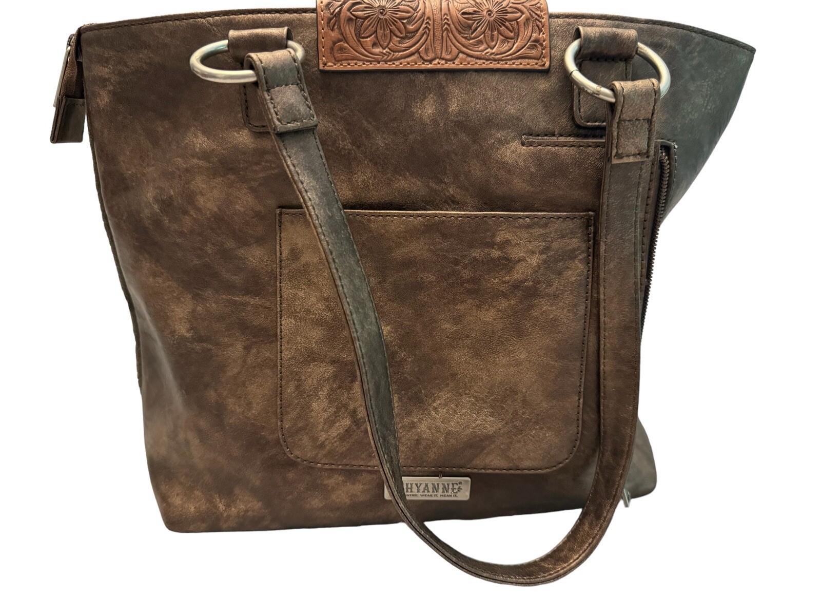 This Shyanne Amber Tooled Embossed Suede Faux Leather Studded Tote is the perfect accessory for anyone looking to add a touch of Western style to their wardrobe. With a bag width of 15 inches, a bag height of 10 inches, and an 11 inch handle drop, this tote is both practical and stylish. Featuring a zip and magnetic closure, this tote is made from high-quality suede material on both the exterior and interior lining. It also includes faux leather handles, studded accents, and Western-themed embossed detailing, making it a unique piece that will make you stand out from the crowd. Whether you're running errands around town or heading out for a night on the town, this Shyanne tote is the perfect addition to any outfit. Excellent condition