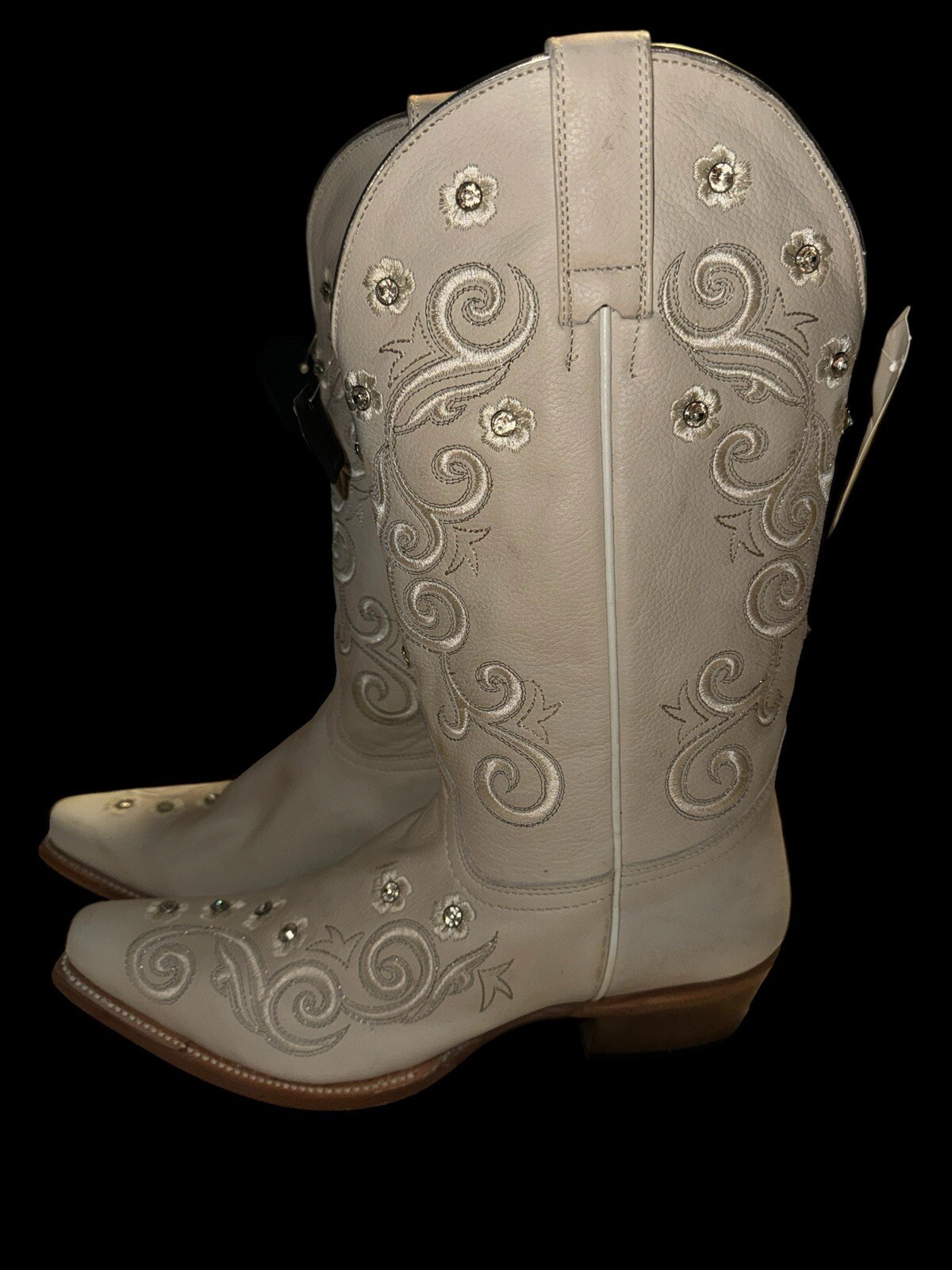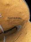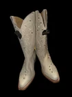 These are new Shyanne Women's Victoria Hueso Western Boots in a size 9.5. They feature a split toe design, studded accents, and a 1.5-inch platform heel. Made of leather with a mid-calf shaft, these boots have a block heel style and a Southwestern theme. The color is white, and they are suitable for travel, parties, or casual wear in all seasons. The boots have a stitched design and are from the Product Line Item #2000359368. Leather upper material and lining 12" upper shaft Snip toe Leather pull tabs Embroidered stitching pattern with embellished studs on shatt and vamp Single stitch welt 3/4 welt construction 3mm EVA insole Western heel Leather outsole Style: BSWSP22L7