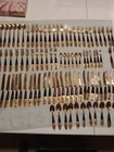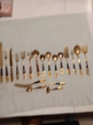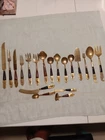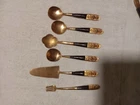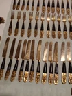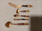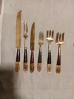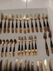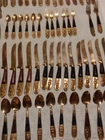 This vintage set of Siam Thailand flatware and serving utensils is a stunning addition to any collection. The wood handles add a touch of elegance and the intricate design on the knife, fork, and spoon make them a unique addition to any dining experience. The set is perfect for anyone who loves Asian style and culture, with the added bonus of being made from high-quality materials such as wood bronze and teak. The set includes forks, knives, spoons, butter knives, small forks, and serving forks and spoons making it a complete set for any meal. The handles are made from wood, adding a touch of warmth and comfort to any table setting. The set is perfect for collectors or anyone who wants to add a touch of exotic flair to their dining experience. Approximately 113+ pieces, but unfortunately, there is no box. All utensils are in good shape, but could use a good polishing.