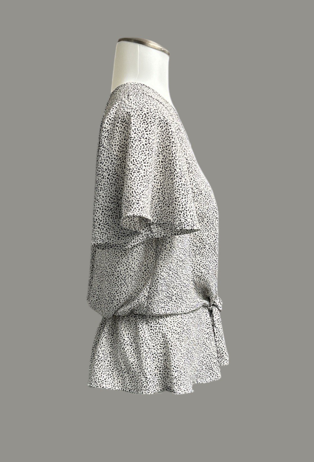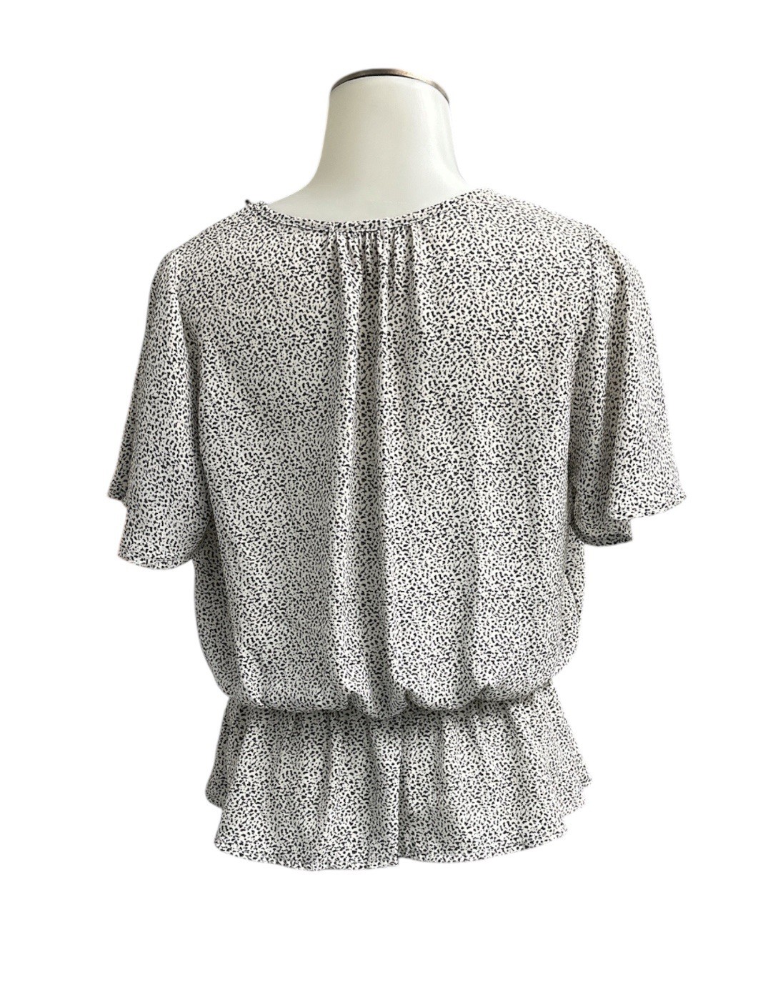 Elevate your wardrobe with this stylish Sienna Sky blouse in women’s size small. The black and white animal print pattern is perfect for adding a pop of personality to any outfit, while the short sleeves and V-neckline provide a comfortable and flattering fit. The peplum design and tie in the front add a touch of femininity to this basic style, making it perfect for both casual and dressy occasions. Crafted from high-quality polyester material, this blouse is durable and easy to care for. The pullover closure ensures a hassle-free dressing experience. Perfect for any fashion-forward woman, this blouse is a must-have addition to your wardrobe. Chest 19” length 22”