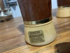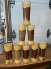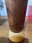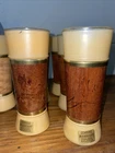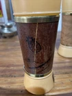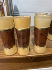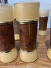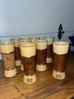 Three glasses , has a minor crack/scratch in the wood material. Does not take away from the look of these glasses set. See pictures. Rarely used,,Add some retro charm to your drinkware collection with these Siesta Ware Frosted Tiki Bar Tumblers. The 8 piece set includes a tea glass, iced tea glasses, pint glass, highball glass, and cocktail glass, all made from wood and glass. The round glasses feature a yellow gold Tiki pattern and a diameter of 2 inches, with a height of 6.5 inches. Perfect for all occasions, these glasses are ideal for serving cold beverages and are sure to impress your guests with their unique design. Hand wash only and manufactured in the United States in 1963, these original Siesta Ware glasses are a must-have for any vintage or retro enthusiast. Enjoy your favorite drinks in style with these Siesta Ware Frosted Tiki Bar Tumblers.