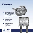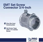 Sigma TC-502 Set Screw Connector 3/4" D Die-Cast Zinc For EMT (25-PACK) Sigma's EMT Set Screw Connectors are used to secure and terminate steel EMT conduit to an outlet box or enclosure in dry locations. These die-cast zinc connectors are approved for concrete-tight applications when taped. UL Listed Yes Knockout Original Size 3/4" Number in Package 25 pk Conduit Compatibility EMT Diameter 3/4" Product Type Set Screw Connector Material Die-Cast Zinc Connector Type Set Screw Connector CSA Listed Yes Weight 2.400 LB
