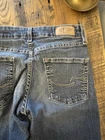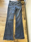 This is a pair of women's boot cut jeans in a modern style by Signature by Levi Strauss & Co. The jeans are in a solid blue color, made of a cotton blend denim fabric with stretch for comfort. They have a mid-rise waist of 28 inches and a size 6 regular fit, with a 32-inch inseam. The jeans feature a zipper closure and are designed for a flattering silhouette with a boot cut style.