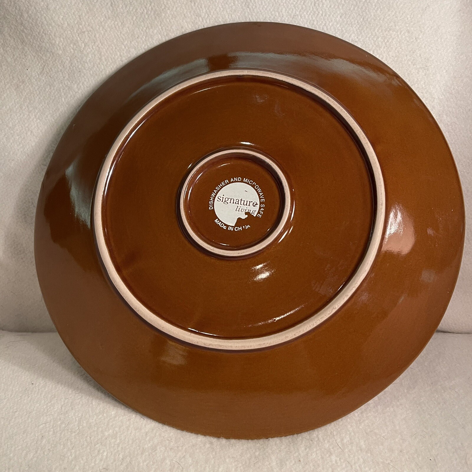 This vintage Signature Living dinner plate features an embossed scroll pattern in a brown/tan color on round stoneware. With a diameter of 11.25 inches, this decorative plate is microwave and dishwasher safe, making it suitable for all occasions. The contemporary style and earthy production technique of pottery add to the charm of this original piece from the 1990s. Excellent condition. No chips or cracks.