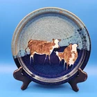This beautiful 10-inch dinner plate from Blue Cow Pottery features a stunning drip glazed ceramic design with a cow pattern in blue color. The plate is handmade with clay material and has a glossy finish. It is a vintage item from the 2000s, but still in excellent condition. The plate is perfect for all occasions and adds a decorative touch to any table setting. Care instructions are included for hand washing only. This original, studio crafted plate is a one-piece set and weighs 1 lb 5 oz. It is a great addition to any collection and produced in the United States.