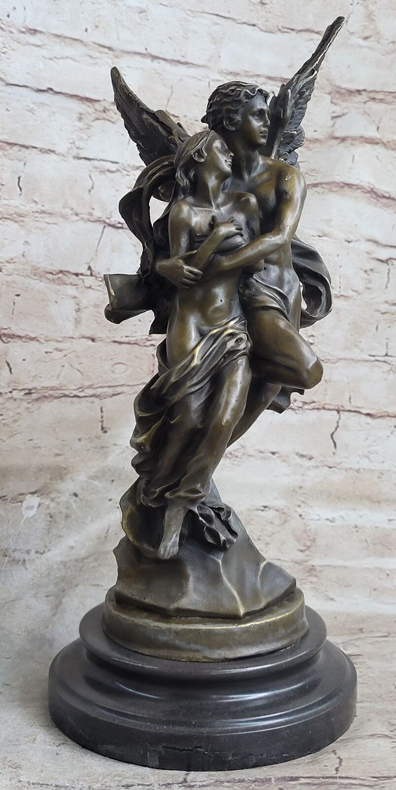 Signed Valentine Cupid Eros Nude Bronze Sculpture Figurine Statue Masterpiece Signed Valentine Cupid Eros Nude Bronze Sculpture Figurine Statue Masterpiece Condition : This sculpture is in a perfect condition. Bronze Dimensions with Marble Base: Height 13" X Width 6" Marble Dimensions: Diameter 6" Height without base:11" Weight:10 LBS Inventory:17Y0774271 This beautiful bronze sculpture depicts the romantic tale of Cupid and Psyche, as they embrace each other at last. Cupid's wings are spread wide as he flies into the sky, holding his beloved in his arms. After years of making others fall in love, Cupid finally has found a love of his own, and he is grateful for it. This stunning sculpture is cast in bronze and sits atop a black marble base. The lost wax method of casting, which has been used for thousands of years, ensures that every detail of this exquisite sculpture is captured. It is signed Jean Debut and is sure to be treasured for years to come. Whether displayed in a business or home, this piece will add grace and beauty to any space. If you're a fan of mythology or simply appreciate the beauty of bronze sculptures, this is a must-have piece for your collection. With its intricate details and romantic theme, this sculpture is sure to capture the hearts of anyone who sees it. Signed Jean Debut Eros and Psyche Greek Mythology Venus Bronze Statue Sculpture YRD-077B Video will open in a new window Using the eBay App? Paste link into a browser window: [isdntekvideo] Shipping Terms : Most of our items are shipped via USPS (United States Postal Service) mail or UPS. Most orders are shipped within 24-48 hours of purchase. Please be aware that not all items are available for USPS shipping due to size and weight. We do ship to Hawaii, Alaska, Canada, Puerto Rico, APO/AE, and U.S. Virgin Islands, however, an additional charge may be required. Please contact us before making any purchases in these areas. For Non-USA customers, you may be responsible for all duty, tax, brokerage fees that may be due upon delivery (shipping costs cover freight charges only). We also ship internationally. Please refer to the "Shipping and Handling" chart for the rates for each area. Payment : We accept just about any form of payment. PayPal, Master Card, Visa or American Express credit cards. Money orders, cashiers checks, and even personal or business checks. For governmental institutions, we will also accept a purchase order. Please understand that for personal or business checks we have to wait for the check to clear (usually 7 days) before shipping. Condition : New Detailed Hand Crafted Hot Cast Bronze Satisfaction Guaranteed. This is Stock Photo, Slight Color Variation!! Listing and template services provided by inkFrog