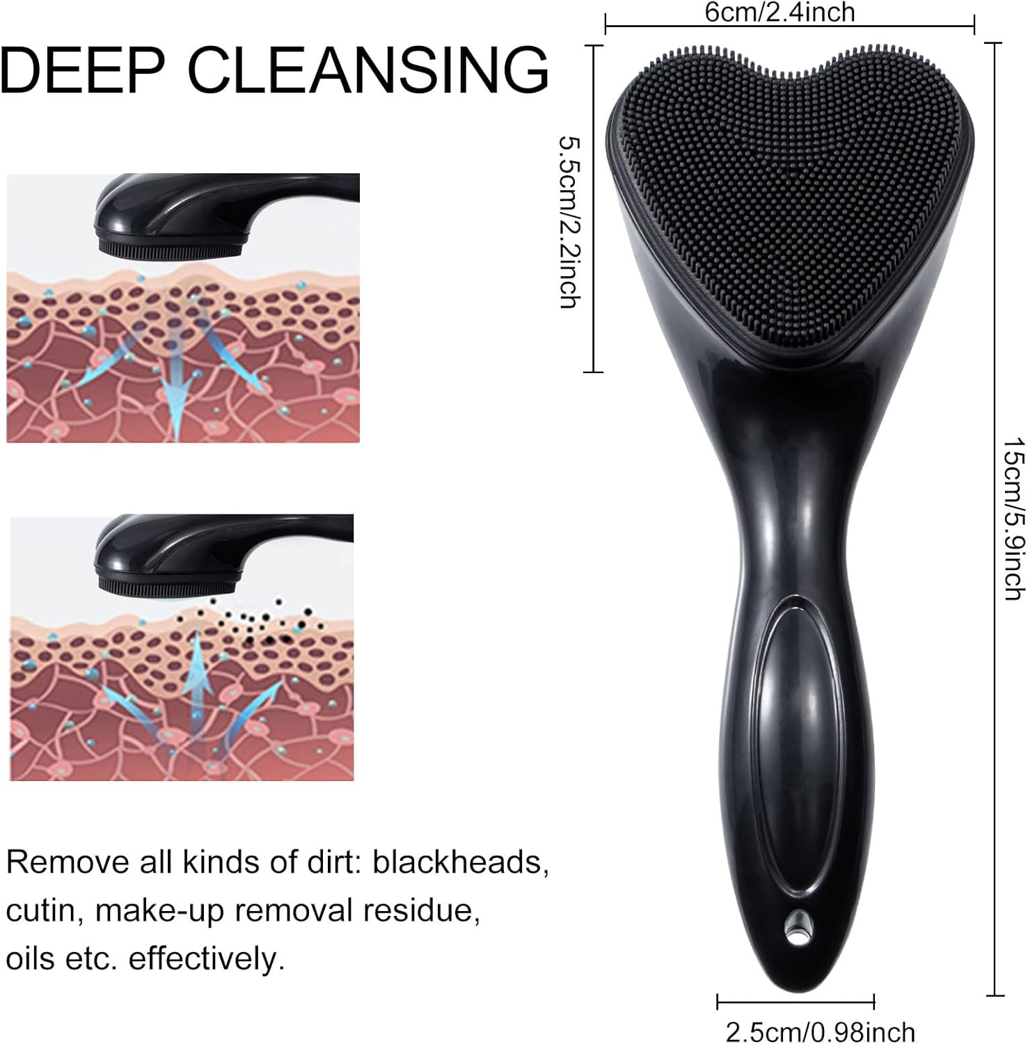 FEATURE: Beomeen silicone face scrubber features a heart-shaped soft silicone bristle design, which gently removes makeup, dead skin, acne, excess oil, and brings a healthy shine to the face, providing you with a comfortable cleaning experience PREMIUM MATERIAL: Beomeen face brush is made of food grade silicone bristles, which are easy enough to exfoliate, gentle, massage and deep cleans, avoiding skin irritation; Ergonomic plastic long handle and hanging hole design (can be hang with string), comfortable to hold, non-slip, easy to store, quick drying PORTABLE: Face cleansing brush is lightweight, convenient to carry and store. It’s a good choice for facial cleansing at home or on travel SPECIFICATION: You will receive 2 pack of manual facial scrubber, meet your daily requirements, convenient to carry in your bags IDEAL GIFT: The cute heart-shaped silicone face brush is a great gift for yourself, your family and friends Product description Why choose Beomeen silicone face scrubber? 1. PREMIUM MATERIAL: High-quality soft food grade silicone bristles. 2. UNIQUE DESIGN: The cute brush head of silicone face brush design with heart shape. It has dense silicone bristles abrasive enough to exfoliate, gentle massage and remove blackhead; Easier to be place and clean, quick drying. 3. FUNCTION/APPLICATION: - Normal type skin, can use the silicone facial cleansing brush in daily makeup removal and wash; - Sensitive type skin, can use the silicone facial cleanser brush 1-2 times a week; - Do a exfoliating for your face regularly, can help skin absorbing the skincare products effectively, stimulating blood flow, also can help in new skin cell growth! Color: Black