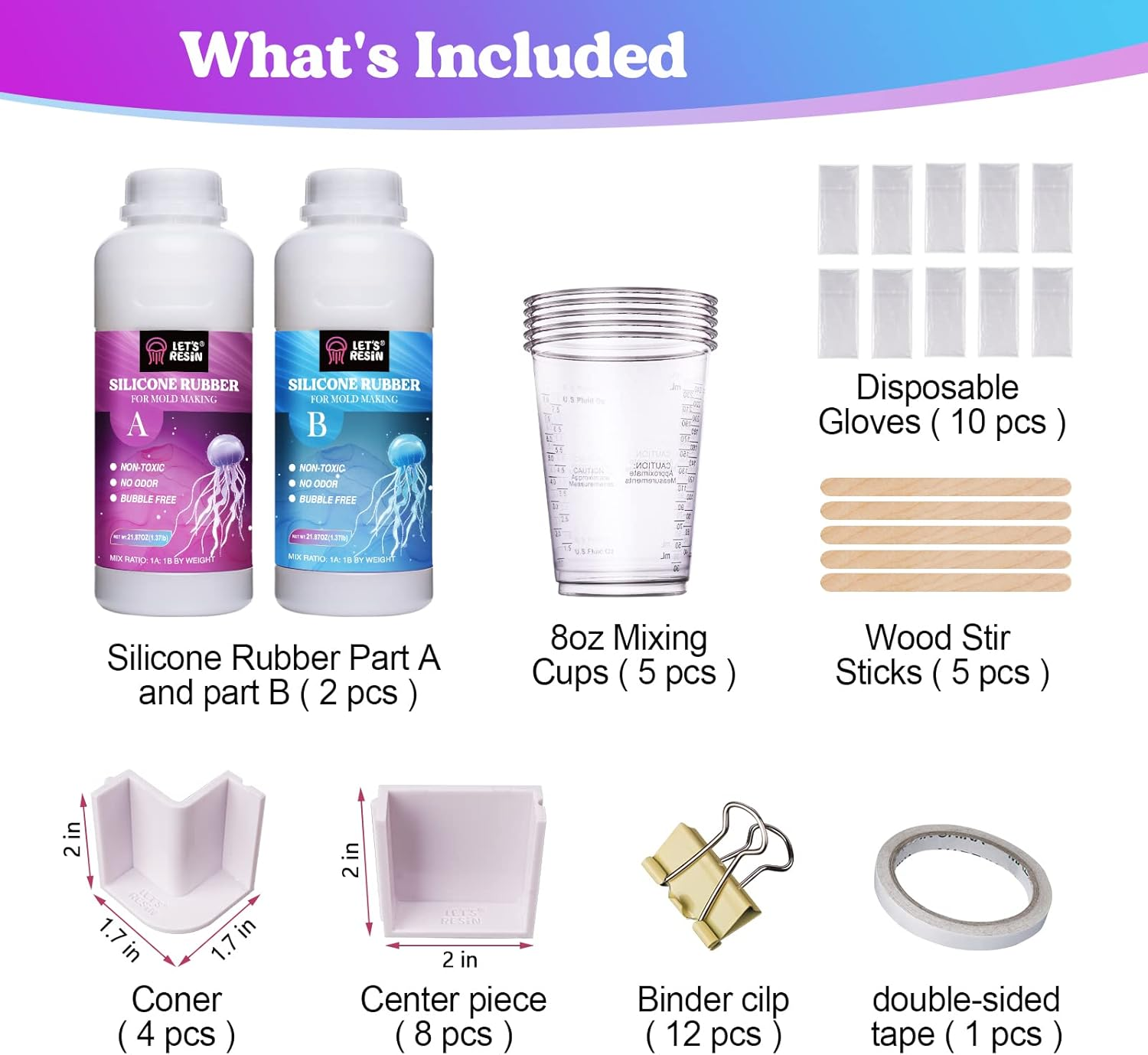【All in One Silicone Kit】: This kit comes with 43oz silicone rubber, adjustable mold housing with maximum size 5.9'' x 5.9''x 2'', stirring sticks x 5 pcs, 8oz plastic measuring cups x 5 pcs; disposable plastic gloves x 10 pcs; If you're new to mold making, LET'S RESIN silicone mold making kit is a perfect choice for you to try, provide everything that you need to get started. 【Fast Cure & No Bubbles】:This mold-making silicone rubber cures at room temperature or can be heated to cure faster. It has 30~40min working time and cures in 3-6h at room temperature 73.4℉/25℃, varying with your mold size and thickness..The bubbles will automatically disappear within 2 hours due to its excellent low viscosity feature, no vacuum degassing is necessary. 【Premium Mold Making Silicone Materials】: Our translucent liquid silicone for mold making is platinum-cured silicone, non-toxic and odorless, with negligible shrinkage, designed for making excellent flexibility and high tear resistance silicone molds; meaning it will last years if taken care of properly. 【Easy Mixing & Pouring】: This silicone molds making kit includes part A and part B with mix ratio 1:1 by weight; Pour the equal Part A and Part B together, then stir the silicone rubber for 3 minutes, very easy to use, no special skills or tools are needed; make sure to scrape the bottom and the sidewalls of the mixing cup to ensure thoroughly mixed. 【Wide Application】: LET'S RESIN high-performance mold making silicone rubber is idea for making highly-detailed molds as well as 3D silicone molds; very ideal for art craft use, casting material like resin, wax, gypsum, soap, candle, polymer clay, easily make your own silicone molds. Translucent clear color allow you to mix with letsresin mica powder, chameleon powder, and even glow-in-the-dark pigment to create a unique color shade and offer you more DIY fun. Product Description LET'S RESIN Flexible Silicone Mold Making Kit, 43oz Mold Making Silicone Rubber w/ Mold Housing, Mixing Cups,Mixing Sticks Why Choose LET'S RESIN molding silicone? Safe & No Odor Thin Viscosity Self-Degassing Easy to Use Fast Cure High Tear & Heat Resistant Flexible & Long Lasting Low Shrinkage Wide Application LET'S RESIN All in One Silicone Kit for Beginner Package Include: 43oz silicone rubber; adjustable mold housing with maximum size 5.9'' x 5.9''x 2''; stirring sticks x 5 pcs; 8oz plastic measuring cups x 5 pcs; disposable plastic gloves x 10 pcs; If you're new to mold making, LET'S RESIN silicone mold making kit is a perfect choice for you to try, providing everything that you need to get started. Specification: Color: translucent Curing Type: platinum-cure Mix Ratio: 1:1 by weight Shore Hardness: 15A Shrinkage Rate: ≤0.1% Working Time: within 30 mins Curing Time: 3~6h at room temperature; or longer time depending on the sizes, thickness & temperature Whether you are a novice trying to make molds for the first time or an experienced artis,LET'S RESIN mold making kit will always be your best choice. When using mold housing, the clamp needs to be clamped, and the bottom edge is sealed with hot melt glue to prevent leakage of silicone. LET'S RESIN silicone for mold making is great for making silicone molds for casting epoxy resin, UV resin, candle wax, soap, plaster, cement