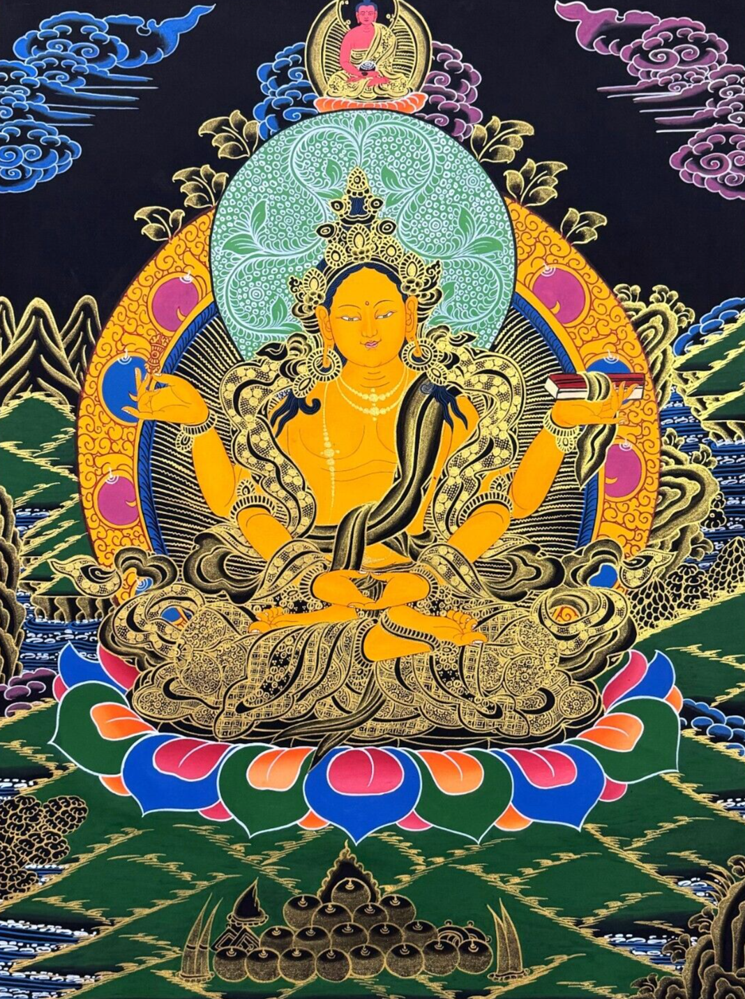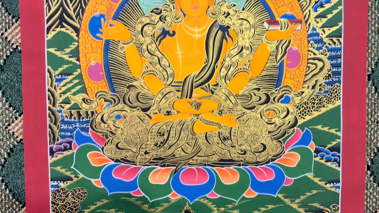 Namaste and Welcome to my Gallery!!! All of the paintings and arts in my gallery are originally handmade and hand-painted by my family members and other local artists who have been practicing their craft for over two decades. My father is Master Artist from Nepal with an experience of more than four decades; you can see some of his work in this Gallery. Also you can see some of the beautiful and soulful artwork of talented local artists from Himalayas. ~~ Prajnaparamita Thangka~~ Silk brocading is a process of framing a Thangka in traditional Tibetan style. The frame is made of beautiful silk fabric having rich colors and patterns. The silk fabric protects the edges of the Thangka, and also makes it easier to hang. A thin silk cover protects the painting when rolled, and may be gathered up to display the painting when hung on the wall. It is generally thought that silk brocade renders a Thangka more attractive and more religious. Prajnaparamita embodies the bliss/emptiness that gives rise to all phenomena—hence her title as The Mother of all Buddhas. She appears as a seated figure clothed in silks; her body is gold in color, and she has one face and four arms. Prajnaparamita has four arms; the two hands in her lap touch each other and form the mudra of meditation, and in the other two hands she holds the Vajra and the texts of the The Perfection of Wisdom Sutra (Prajnaparamita Sutra). [Size = 122cm x 93cm] Material Used: • Cotton Canvas • Natural Pigments and colors • Gold leaf ~Excellent for meditation or home/office decor, ~Tibetan Yoga Wall Art ~Genuine 100% hand-painted from Himalayas Please feel free to contact me if you have any question regarding the painting.