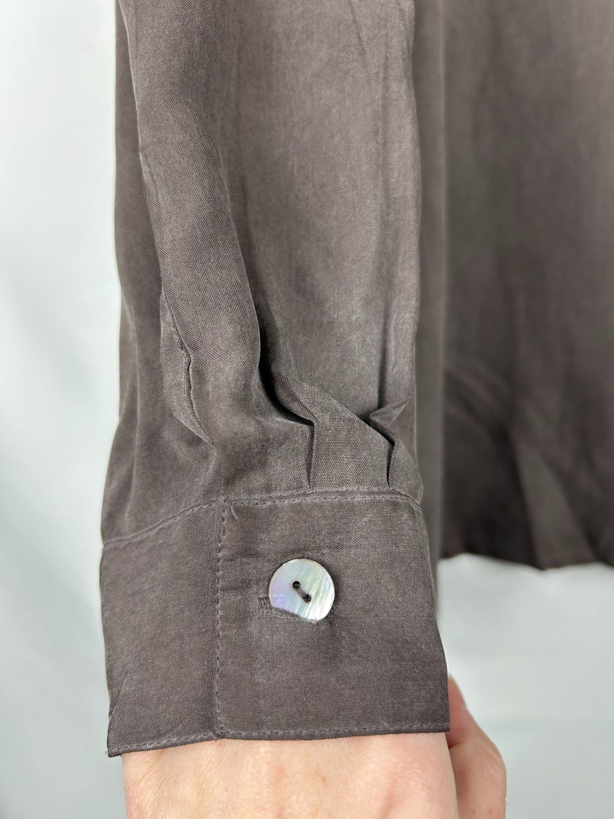 This 100% silk button-up shirt offers a sophisticated look with its long sleeves and single chest pocket. Versatile for professional or casual settings. • Button-up closure with mother-of-pearl buttons • Single chest pocket for added utility • Long sleeves with buttoned cuffs • Lightweight and breathable silk material • Collar adds a polished touch Chest = 26 inches Length = 28 inches