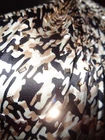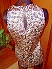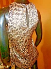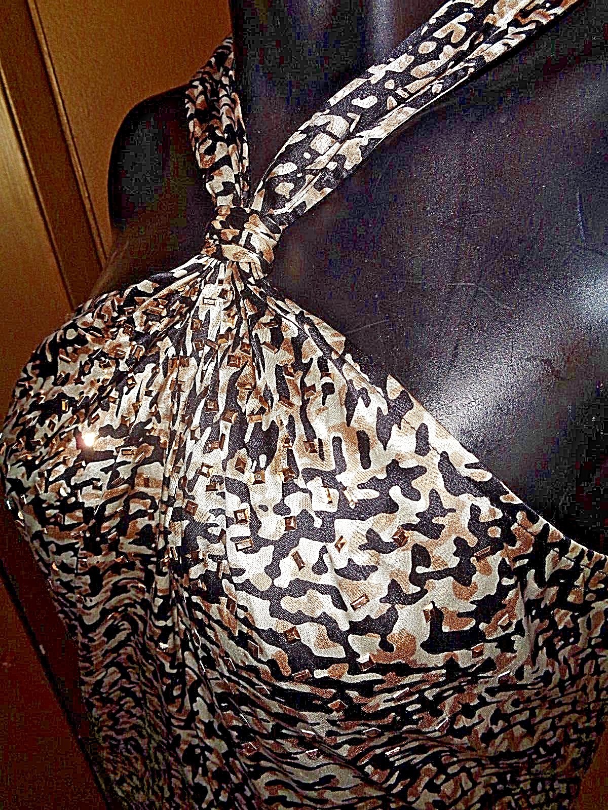 This sheer 'sass and class', cross-over halter, has light gold tone front beads/chips embellishments, with front notch. Soft & luxurious. Hidden side zipper & back one button keyhole opening. Silk/spandex blend. Underarm across apx. 16". Length apx. 26". May fit other sizes. Payment is due within 2 days of winning auction.