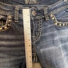 Good Pre Owned condition. The patch has some wear. Please see photos for details. SUPER FAST SHIPPING!!! We ship next business day! If you aren't happy with your purchase we offer 30 day FREE returns. No questions asked! Silver Women Aiko Low Rise Stretch Slim Bootcut Thick Stitch Studded Jeans 29x31