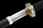 Product Parameter: NUMBER:TYQ21 NAME:冰魄太刀 OVERALL: 103 cm/40.6'' BLADE: 70 cm/27.6'' TSUKA: 26 cm/10.24'' WIDTH: 3.2 cm/1.26'' THICKNESS: 0.7 cm/0.28'' HRC(hardness): 58 CRAFT: Fully hand folded and forged 15 times(32768 layers) ,water quenching,hand-polishing etc. MATERIAL: Damascus folded T10 steel SHAPE: Shinogidukuri NAKAGO: Full-tang ,2 meguki fix the handle vertically,very firm KISSAKI: Medium(chūkissaki) TSUKA: Hard wood core, hineri maki SAMEGAWA: Black rayskin FITTINGS: Alloy, silver dragon design SEPPA/HABAKI: Brass SAYA: Lacquered wooden scabbard SAGEO: Black&White Japanese thick synthetic silk wrapping cord The steel we use is not the normal steel with the truck or cars or other life electrics, the steel use for the blade contents much more carbon and the purity can not be comparable. * It's a functinonal sword. After test, it can cut bamboo, A4 paper and water bottles,etc . * Package include 1 sword + 1 random bag. Manual grinding: Using the unique bright stone of Longquan Town, hand grinding, very test sword casting skills and technology, grinding out the pattern effect is special texture! Ancient quenching: Modern vacuum heat treatment can meet the hardness requirements of most swords, but the traditional quenching method has better effect, can soften the medium strip steel, and the hardness is higher. Additional Service About us Sword Noun Explananation Delivery details Sword maintenance Additional Service It's free for engraving English words, Chinese Characters and Japanese Kanji , etc. You need pay extral $20-30 for engraving patterns. Sharpness Most of our blades are sharp. We can also make the blade unsharpened for free if you require. Matching Swords Set If you buy one katana, we can make a matching Wakizashi or Tanto for you. The price varies from different swords. Please contact us if you need make custom matching set. About us We have our own sword-casting factory. The factory is located in Longquan, a small town with a long history of sword-casting in China. Most of the famous Swords in China are made there. Rich raw materials, skilled technology, traditional sword casting technology from generation to generation. Manual production really takes a lot of time. We will prepare most products in advance ,and arrange delivery within about a week. However, sometimes the delivery time is delayed due to weather or raw materials,etc. we hope to get your understanding. Feel free to contact us to inquire about the status of your order. Each handmade sword is unique. Our swords are great for gifts or for your own collection. Our swordsmithing master makes every sword attentively, hope you can feel our sincerity. We will also give you the best customer service, any questions please feel free to contact us. Sword Noun Explananation Quenching After the blade has been shaped, the sword would be quenched. We quench our swords in either water or oil. Water quenching produces a tougher edge which can also be hardened further more using clay. Blades quenched in oil are still considerably hardened and do have superior flexibility compared to a water quenched blade. Folded Steel : In the forging process , the most useful process is the folding, where the metals are forge welded, folded, and welded again, as many as 124 times(15 times is the best). The folding removes impurities and helps even out the carbon content, while the alternating layers combine hardness with ductility to greatly enhance the toughness. The less impurities, the harder and sharper the blade will be. We have done cutting tests on the blades. it can cut bamboo(young bamboo tree), grass mattings and slice paper(The blade should be tilted at 45 degrees). Clay tempered : To maximize both the cutting edge and the resilience of the sword spine, a technique of differential heat-treatment is used.The sword is painted with layers of clay before heating, providing a thin layer or none at all on the edge of the sword, ensuring quick cooling to maximize the hardening for the edge.A thicker layer of clay is applied to the rest of the blade,causing slower cooling.This creates softer,more resilient steel, allowing the blade to absorb shock without breaking. About 1095 carbon steel : The best quality of high carbon steel is at 1095, the carbon content was 1.03%, and the element contains a small amount of chromium, molybdenum, vanadium, after heat treatment can reach HRc58-60 hardness, toughness is very good, but not resistant to rust, more be applied to traditional european-style hunting knife, large cutting knife and military dao. Such as the United States during world war ii "KA - BAR" saber is in 1095 as the blade material. Kobuse : The vast majority of modern katana and wakizashi are the maru type which is the most basic, with the entire sword being composed of a single steel. The kobuse type is made using two steels, which are called hagane (edge steel) and shingane (core steel). Steel of different materials is forged and welded together to hammer the basic shape of the sword. This allows the overall blade to have a higher toughness and absorb a lot of impact. Reducing the possibility of breaking or bending to some extent. Makes the blade not only has high hardness, but also has super toughness Delivery details a) Import duties, taxes and charges are not included in the item price or shipping charges . These charges are the buyer’s responsibility. b) If you do not receive the package, or the package is damaged during transportation. We'll take care of it. Please feel free to buy. c) If it is mentioned in the product description that the package includes the sword bag or sword holder , the style will be random. The sword holder or sword bag on the ebay picture is the props we use for shooting. If you really like a style, please contact us before buying. d) If you have any problem after recieve the package (wrong size, wrong style, etc.). We always provide you with the best after-sales service. Please give us a cha