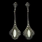 Solid sterling silver 925 stamped earrings in an art nouveau style set with genuine natural creamy white mother of p earl marquise shaped cabochons each measuring 15mm x 5mm set into a drop design with genuine swiss marcasite stones each measuring 1mm x 1mm. The earrings measure 67mm x 22mm and have a post and butterfly fastening. GIFT BOXED Thanks for looking and please take time to view my other listings #14659