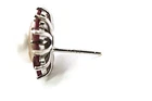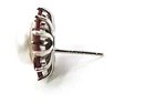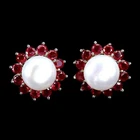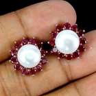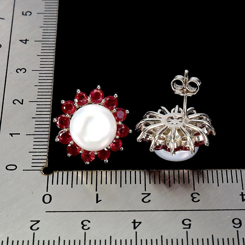 Solid sterling silver 925 stamped white gold coated earrings featuring round cut faceted genuine natural mined red ruby gemstones each measuring 3mm x 3mm set into a round design with a genuine natural pearl in the centre measuring 10mm x 10mm to form a cluster design. The earrings measure 16mm x 16mm and have a post and butterfly fastening. GIFT BOXED Thanks for looking and please take time to view my other listings #18624