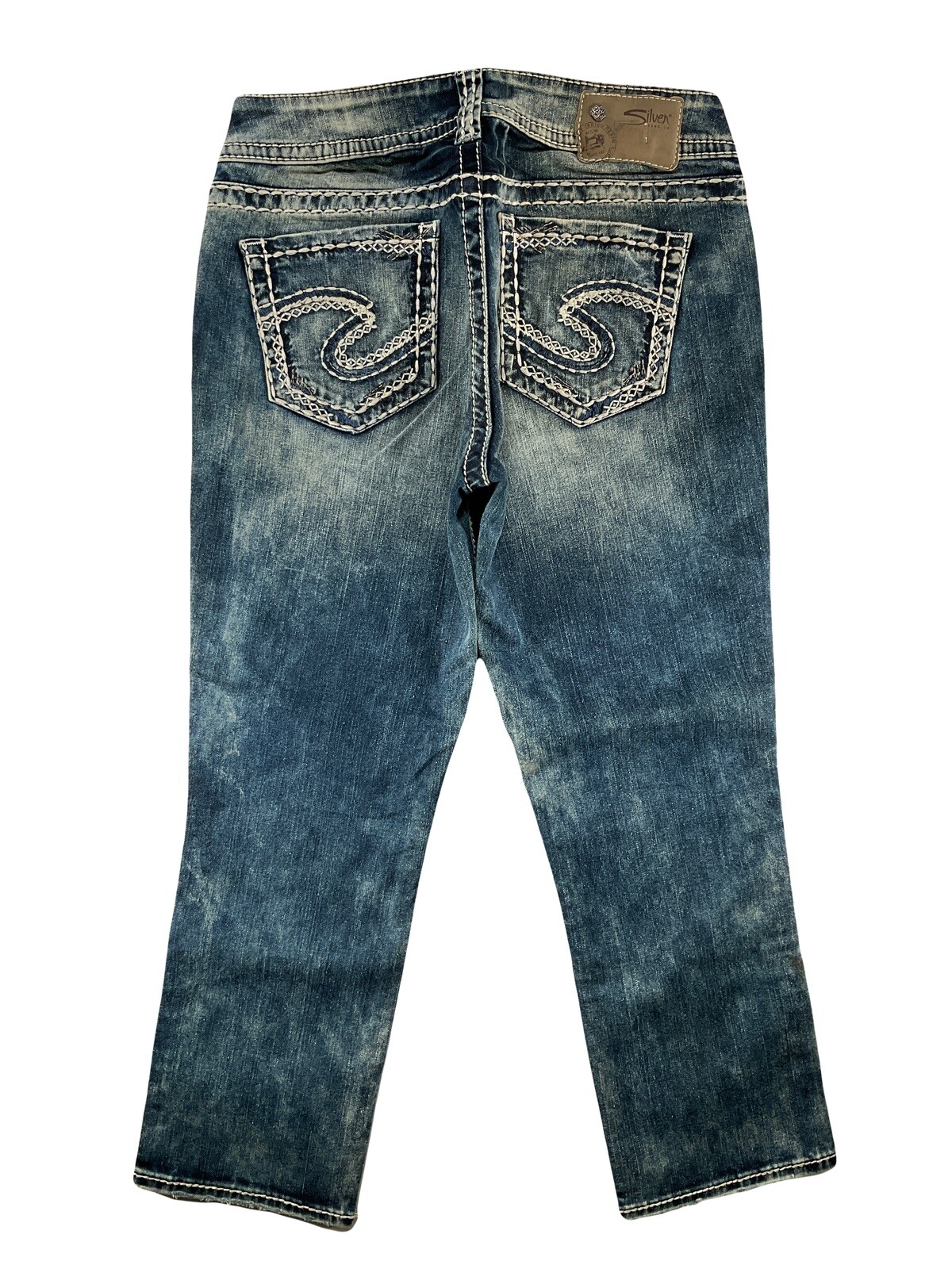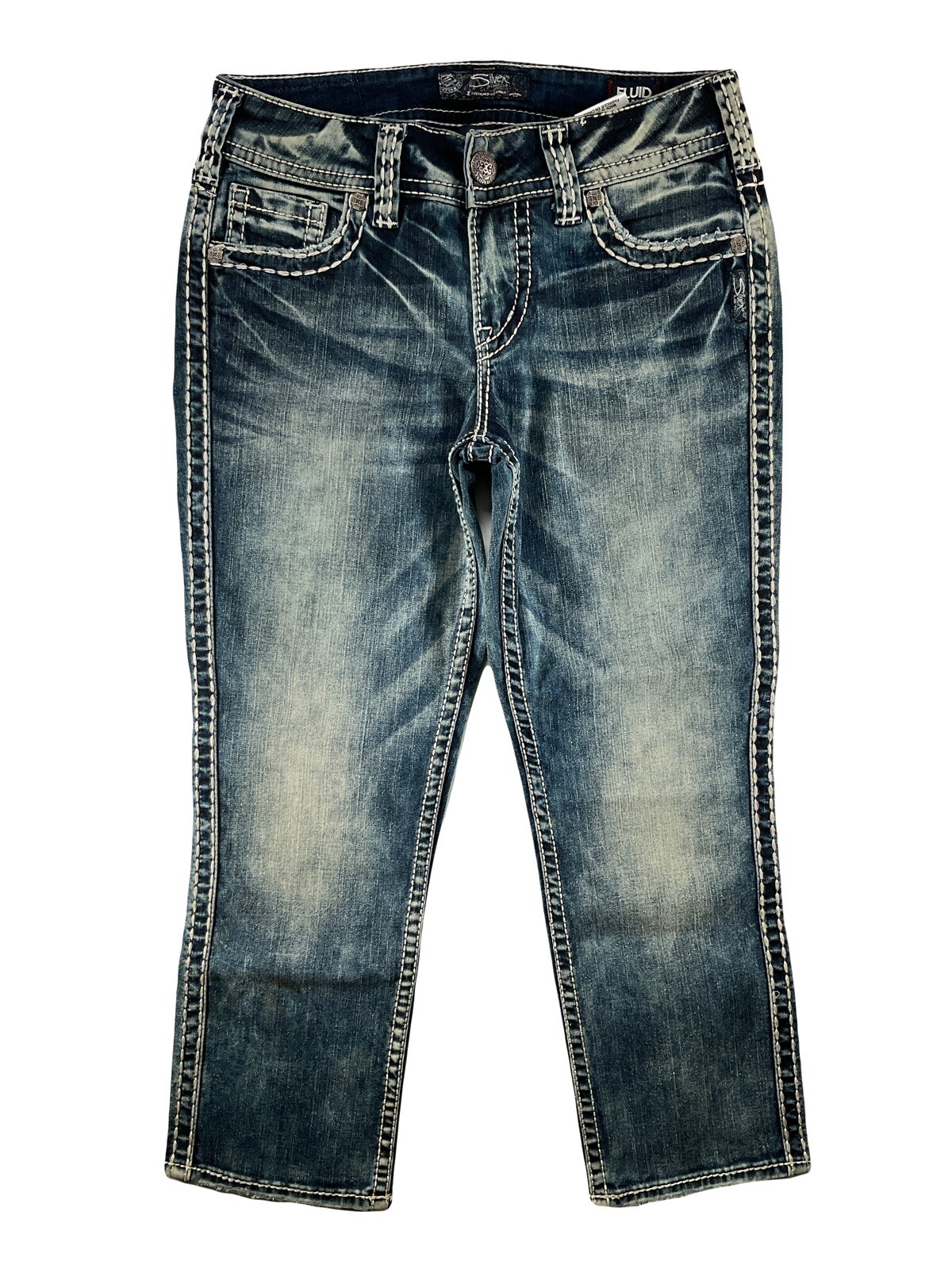 Silver Jeans Mid Rise Suki Capri Cropped Stretch Thick Stitch 28 x 24 DEFECT New With Defect- Brand New, Never Worn Has Defective Silver Jeans Label And Faint Spots On Front Bottom Right Leg Inside Tags Slit/Written On To Prevent Store Return Size - 28 Inseam - 24" Waist Laying Flat - 24" Mid Rise Cuffed Capri Stretch Jean Curvy Fit, Slightly Eased Through Hip And Thigh 73% Cotton, 13% Viscose, 13% Polyester, 1% Elastane Dark Blue Color Embroidered Back Pockets Hand Sanding Grinding, Whiskering Details Zip Fly, One Button Waist Closure SHIPPING Ships same day as purchased if paid by 12pm MST. If not we will ship next day. FEEDBACK Customer satisfaction is our NUMBER ONE GOAL! We are here to help... always! If you feel you cannot leave us positive feedback, PLEASE message me first to work something out. We will always find a way to ensure we are both happy. RETURNS If you are not satisfied with your item returns and or exchanges will be gladly accepted Returns within 30 days of item being delivered. When we receive the item back in the same condition as when you received it, we will refund your payment amount. If any item is returned to us in a condition different from the condition it was in when we delivered it, or if we believe in good faith that the item returned is not the same as the item we shipped to you, it will be a case by case basis and we have the authority of taking up to 50% of the sale amount.