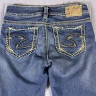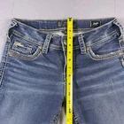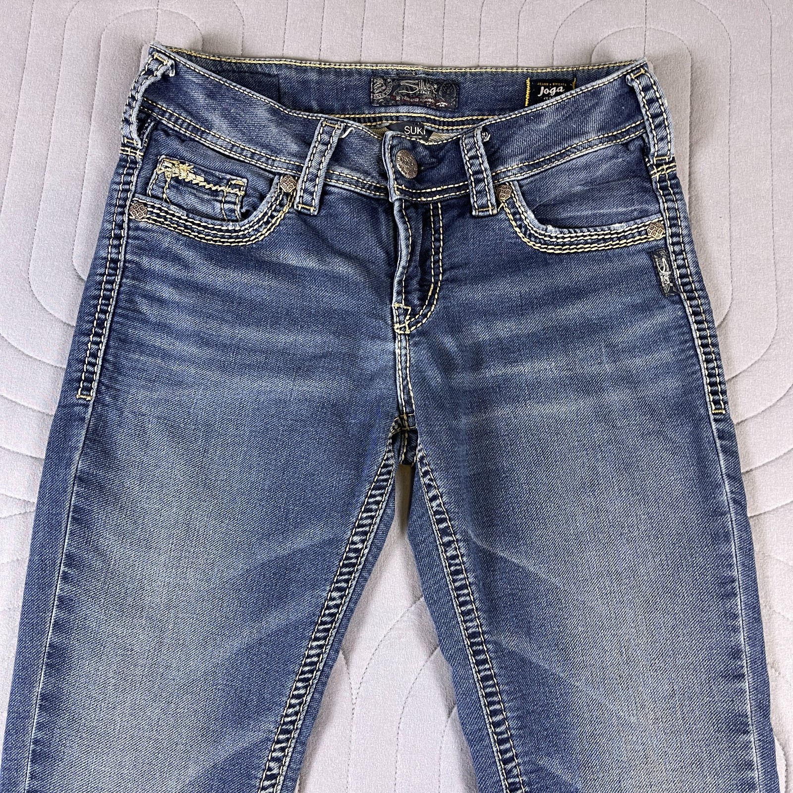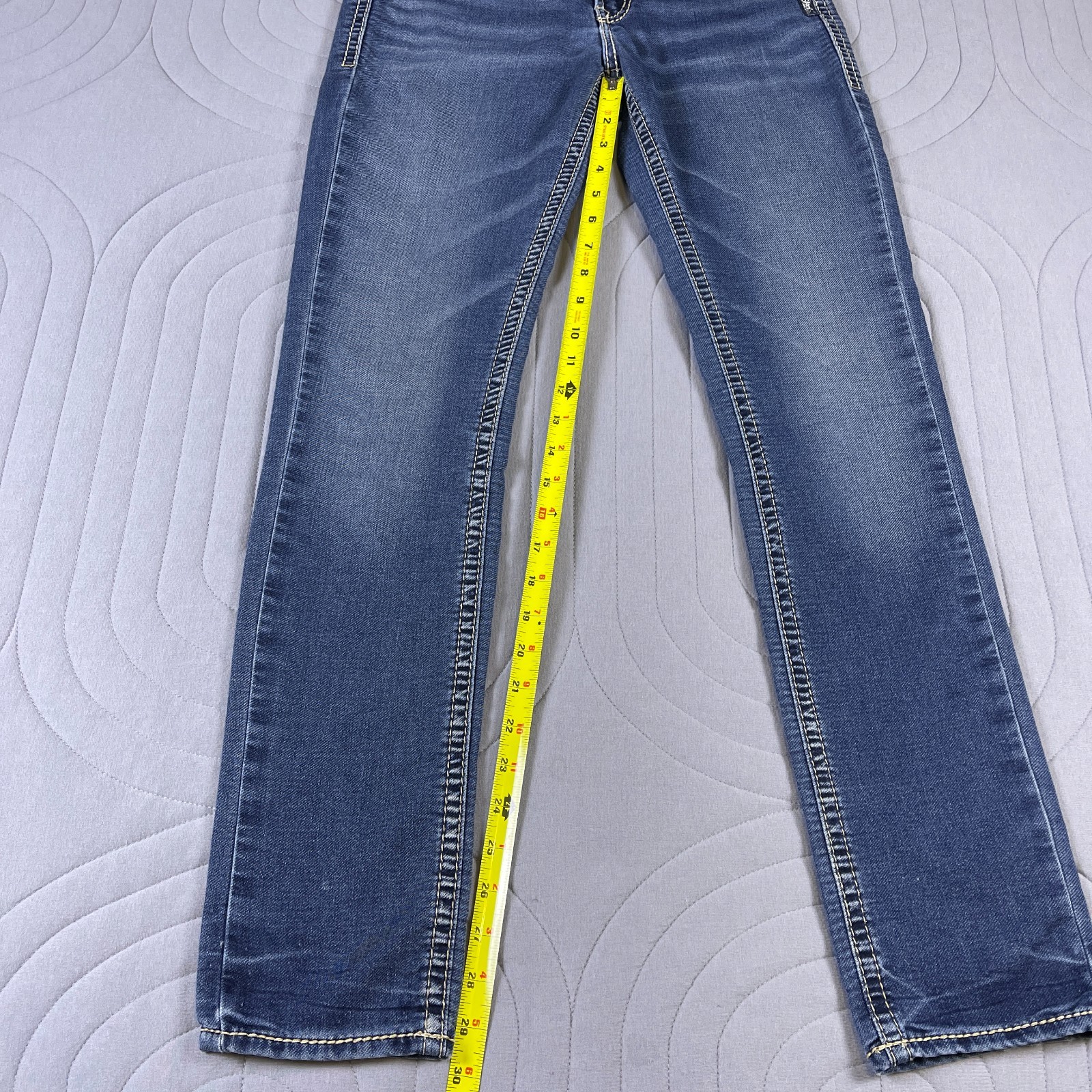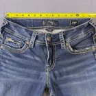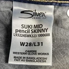 These Silver Jeans Suki Mid Pencil Skinny Jeans for women in a size 28x31 feature a dark wash stretch denim fabric that is machine washable. The jeans have a solid pattern with a mid-rise fit, 5-pocket design, and a skinny style. Made with a cotton blend material, these jeans are perfect for all seasons and are a stylish addition to any wardrobe. The brand, Silver Jeans, is known for their quality and attention to detail, making these jeans a versatile and comfortable option for everyday wear.