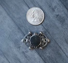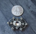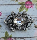 Silver-tone metal set with clear crystal and rhinestones. This would make a great English collar brooch or Stock Tie brooch - lays nicely on the collar and no more poking the skin or damaging your apparel. This also would make a lovely scarf brooch or lapel brooch! Why choose magnetic brooches over traditional pins? Because they are strong and much easier to use. No more struggling to attach pins, poking yourself and repeating the process because you didn’t get it placed correctly the first time. With magnetic brooches you just slide the brooch into the desired place – Wallah! No damage to your cherished attire. Magnetic brooches are perfect for horse show attire – Collar brooches, Lapel pins, Stock Tie pins. Why risk snagging your show coat or show shirt with pins? Magnets are very strong and will securely hold to your attire. One magnet is adhered to the jewel and another is supplied to hold in place. Place fabric between the jeweled magnet and the back magnet. Quality materials used, no acrylic or plastic. Items are made of metal alloys, faceted crystals and glass. Choking hazard, and can be dangerous if swallowed. Please keep out of reach of children and do not place in the mouth. Please see instructions sent with item for full product care.