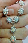 Solid sterling silver 925 stamped white gold coated necklace in a stylish design featuring oval cabochon genuine natural mined opal gemstones which are white with rainbow fire colour flashes each measuring 6mm x 4mm each individually set within a border of bright white round cut faceted lab created zircon stones each measuring 2mm x 2mm with the back of the necklace being a silver chain design. The necklace measures 39 to 44cm 15 1/2 to 17 1/4 inch using the integral extender chain . Weight 14g GIFT BOXED Thanks for looking and please take time to view my other listings #16654