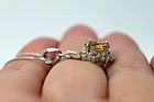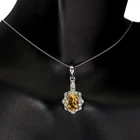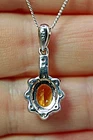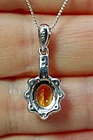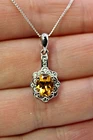 Solid sterling silver 925 stamped white gold coated pendant featuring a genuine natural golden yellow oval cut faceted citrine gemstone measuring 8mm x 6mm surrounded by a fancy border set with bright white round cut faceted lab created zircon stones each measuring 1.5mm x 1.5mm. The pendant measure 24mm x 10mm including bale and comes complete with a free 18 inch solid sterling silver 925 chain. GIFT BOXED Thanks for looking and please take time to view my other listings #17252