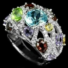 Solid sterling silver 925 stamped white gold coated ring featuring a genuine natural mined heated 9mm x 9mm round cut faceted sky blue topaz gemstone set with oval and round cut faceted genuine natural mined gemstones measuring 3mm x 3mm, 5mm x 4mm and 7mm x 5mm in purple amethyst, golden citrine, red garnet and green peridot and 1mm x 1mm bright white round cut faceted lab created zircon stones. The ring measures 18mm x 14 mm and it is a size Q 1/2 (US 8.5). GIFT BOXED Thanks for looking and please take time to view my other listings