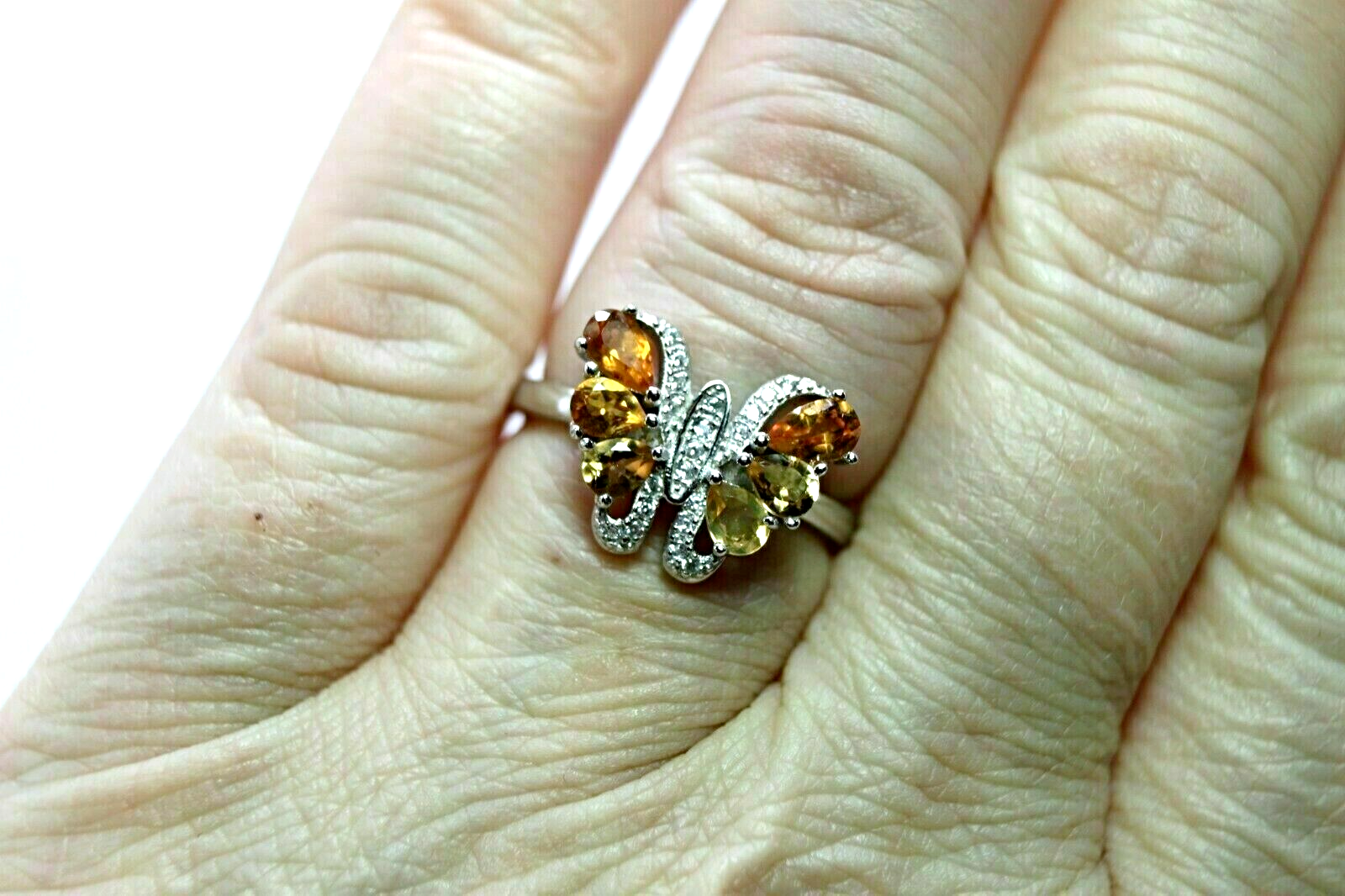 Solid sterling silver 925 stamped white gold coated ring featuring pear cut faceted genuine natural mined golden citrine gemstones each measuring 5mm x 3.5 mm and 4.5mm x 3.5mm set within a butterfly design set with round cut faceted bright white lab created zircon stones each measuring 1mm x 1mm and 1.2mm x 1.2mm . The face of the ring measures 16mm x 13mm and it is a size P (US 7.75). GIFT BOXED Thanks for looking and please take time to view my other listings #16514