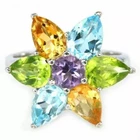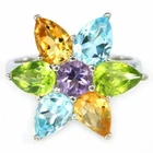 Solid sterling silver 925 stamped white gold coated ring featuring a central genuine natural mined round cut faceted purple amethyst gemstone measuring 5mm x 5mm surrounded by genuine natural mined pear cut faceted 7mm x 5mm green peridot, golden citrine and heated blue topaz gemstones. The face of the ring measures 20mm x 20mm and it is a size O (US 7.25). GIFT BOXED Thanks for looking and please take time to view my other listings #4796