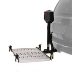 A safer, easier alternative to transporting mobility scooters, the Silver Spring Electric Scooter Lift and Carrier allows you to roll the scooter into position and raise it up electrically for hitch-mounted transport. With a 350 lb. capacity, it accommodates most smaller scooters on the 38” L x 27.5” W platform and has an extendable cradle that pulls out to 46”. Four self-tensioning retractors secure devices to the platform without the hassle of keeping separate tie-down straps on hand. Installation requires no drilling or modifications to your vehicle, and the lift comes standard with the necessary wiring harness, a license plate holder, a warning LED light, and a manual back-up hand crank. Designed to be as unobtrusive as possible, the lift folds against the vehicle when empty to save space while improving visibility. For simplicity, one key provides full control. The Silver Spring power chair lift and carrier is compatible with most vehicles equipped with a Class II hitch or higher. Please read "How to Choose a Hitch-Mounted Carrier" on the right for more information. When a device is loaded and tied down, it raises up in 20 seconds. When empty, it folds in 6 seconds. Manufactured from high-strength aluminum platform and steel frame 350 lb. weight capacity Designed for Class II or higher Platform measures 38” L x 27.5” W with an adjustable cradle that extends to 46” Includes four self-tensioning retractors, license plate holder, manual back-up hand crank, wiring harness and warning LED light Carrier lifts up in only 20 seconds, and folds in 6 seconds; folds against vehicle when not in use One-key control for quick and simple use Usage Guidelines Please note, hitch-mounted mobility carriers are not recommended for use on tow-behind trailers including 5th wheel and camping trailers, motor-homes or RVs. Never exceed the maximum tongue rating of your trailer hitch and be aware that your hauling weight may be limited by your vehicle's suspension. Some vehicles may require air shocks or heavier springs to stiffen up the suspension and prevent sagging. Carriers are not recommended for hitches less than 12" from the ground to the bottom of the hitch without the use of a riser adapter. A license plate riser is required to be used with this carrier in the following states: AK, AL, AZ, CA, CO, FL, HI, ID, KS, MT, ND, NV, OR, PA, SD, TX, UT, VA, WA. This is to ensure that the license plate is easily identifiable at all times, even when the carrier is unoccupied. It is your responsibility to understand your state's laws and regulations, as well as any states you will be traveling through. Do not lift mobility device while occupied. Length: 38" Width: 27-1/2" Height: 42" Hitch Class: II, III, IV Hitch Size: 2" Maximum Hitch Height: 18" Maximum Capacity: 350 lbs. Weight: 96 lbs. Material: Aluminum