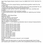 Wheel Housing Arch Lining Cover Bulb Change Flap For BMW F22 F23 F32 F33 US 12.99 USD Free shipping L1B/6-01 For OSRAM LED A32A XLS L1B/6-01 6000K LED Modules White Light US 22.65 USD Free shipping High Level Brake LED Light Rear Third Stop Lamp For Nissan X-TRAIL T31 08-13 US 35.99 USD Free shipping NEW 2X Rear ABS Wheel Speed Sensors STC3385 ALS1909 for Land Rover Range 94-02 30.65 USD Free shipping Front ABS Wheel Speed Sensors STC2786 for Land Rover Range Rover P38 94-02 US 19.65 USD Free shipping MK-LR4B-01X For OSRAM LED for KOITO LR4B 12V Taillight LED Modules US 16.65 USD Free shipping SAFE & SECURE SHOPPING 100% SATISFACTION GUARANTEED FAST SHIPPING Store Categories Store Categories Other eBay Motors Grille You may also like 10pc For PHILIPS RC10W 12V 10W BA15s 12814 Bulbs Automotive Singnaling Light U4 12.64 USD Free shipping Ignition Distributor Timing SPOUT Connector for Ford Mustang F150 E53Z-14489-C 13.79 USD Free shipping 1K8837879 White Left Door Handle Cap Cover For VW Golf Scirocco 2009-2016 F7 U4 9.99 USD Free shipping 2x Engine Breather Turbo Intake Seal Kit Fit Mercedes OM642 Engines 6420940080U4 10.65 USD Free shipping Universal SUV 4WD Spare Wheel Storage Bag Tire Cover Size 16" Inches Black CAU4 32.66 USD Free shipping Rear Right ABS Wheel Speed Sensor 4670A580 For Mitsubishi Lancer Outlander D U4 16.65 USD Free shipping Silver Start Stop Engine Switch Button Cover For BMW F20 F30 F10 F01 F25 F26 U4 Product Description Start Stop Engine Button Switch Cover For BMW F20 F10 F01 F48 F26 F15 F16 Feature: 1: According to the original factory specifications,perfect match for the original car. 2: Own different test machines to design exact accurate parameter for our products.All switches were tested for performance. 3: Made by high quality material, lightweight, anti-rust, colorfast and durable. 4: Aftermarket product with premium quality. 5: Stable performance, high reliability,suitable for replacing your broken one. Specifics: Condition: 100% Brand New Material: Plastic Color: As shown in the picture Placement on Vehicle: Front Fitment Type: Direct Replacement Size: As shown in the picture (Please allow 1-3 mm measuring deviation due to manual measurement.) Fitment: Fit for 1 Series F20 F21 2012-2018 Fit for 2 Series F22 F23 2015 2018 Fit for 3 Series F30 F31 2012-2018 Fit for 4 Series F32 F33 2014-2018 Fit for 5 Series F10 F11 2011-2018 Fit for 6 Series F12 F13 2012-2018 Fit for 7 Series F01 F02 2009-2018 Fit for X1 F48 2018 Fit for X3 F25 2011-2018 Fit for X4 F26 2015 2018 Fit for X5 F15 2014-2018 Fit for X6 F16 2015 2018 Package Include: As you choose!(instruction manual is not included) Note: Please check the description or use the year/make/model check finder and replace part numbers to confirm the compatibility before purchasing. About Us Shipping Terms Contact Us About Us Bruce & Shark is a company Focus on Motorcycle parts more than 11 years. The design inspiration comes from the awe of the vast sea and worship of the fighting sharks, therefore Bruce & Shark takes a shark as brand logo. Since its inception, we have always put the "customer first" and "top quality" as our principle. We specialized in selling Motorcycle parts and providing customers with various types of high-quality products. Our brand Bruce & Shark has enjoyed good reputation in America, Europe, Japan, Canada and Africa, covering more than 30 countries. Our vision is to deliver high-quality Motorcycle parts products and sincere services to the world. Our main products are motorcycle mounted, fuel pump, stator, windshield, Seat Cover, motorcycle fairing. Welcome to our shop to choose products that are worth more for your Motorcycle! Please Add me to your list of favorite sellers and visit often. Thank you for your business. Shipping Shipping Terms International Buyers – Please Note: 1. Import duties, taxes and charges are not included in the item price or shipping charges. These charges are the buyer’s responsibility. 2. Please check with your country’s customs office to determine what these additional costs will be prior to bidding/buying. 3.Buyers' Information: We strive our best to provide you the most reliable, affordable way of shipping service. But sometimes international delivery is highly depended on the courier company and local customs/duties. If you do not receive your item on time, please sent us ebay message immediately for further assistance. Thank you for your understanding. Terms We stand behind everything that we sell and will do everything possible to assure you are satisfied. When you receive your purchase if you are not 100% satisfied, please sent me ebay message and we will do our best to make you happy. If you still want to return your purchase, simply ship the item(s) back to us and we will refund your original purchase price and the original shipping charge. Buyers are responsible for the postal cost of returning the items. We must be notified of the intent to return your item within 30 days of receiving the item. Items returned must be in the same condition that they were received. How to return 1,Please ask us for return address . 2,Shipping back the package . The RMA#(Return Merchant Authorization Number = Your ebay ID) must be clearly written on the return package ,Otherwise the package will be refused. 3,Sent us the return tracking number. 4,All returns will be inspected prior to a credit being issued. Contact Us Sent ebay message in English If you have any questions, our Customer Service staffs welcome you to sent me ebay message. We strive to answer all questions and resolve any problems as quickly as possible. Business Hours: HongKong Time GMT+8:00 Monday-Saturday 9:00-17:00 Copyright © 2022 Tongtool