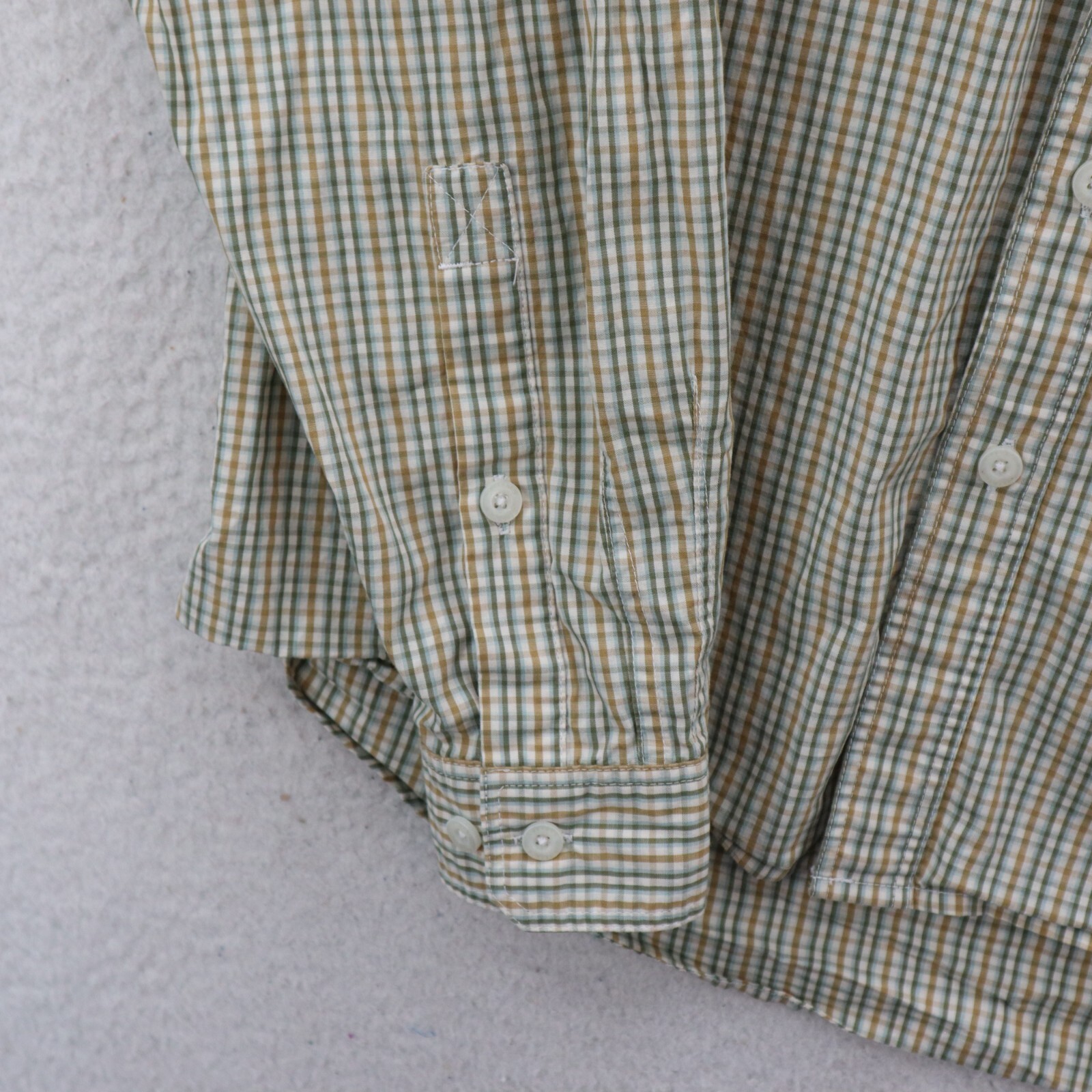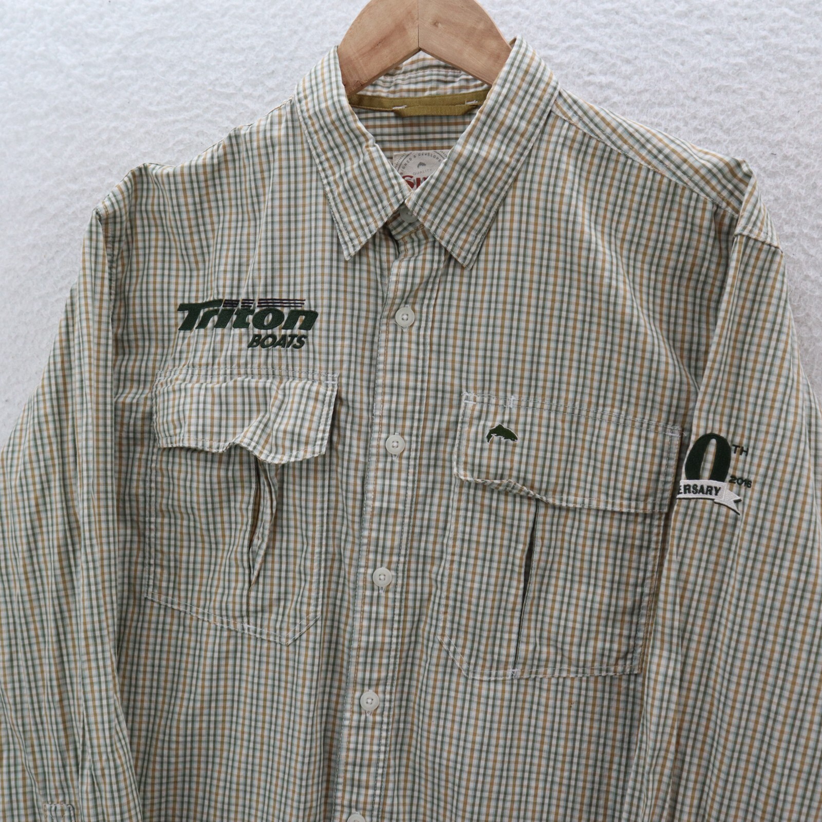 Simms Shirt Mens Medium Green & White Plaid Fishing Hiking Gorpcore Triton Boats This item is in pre-owned condition and therefore may show signs of previous use, such as small stains, holes, or other wear. Please view all of the items photos as any defects will be documented there. Measurements can be seen in the photos.