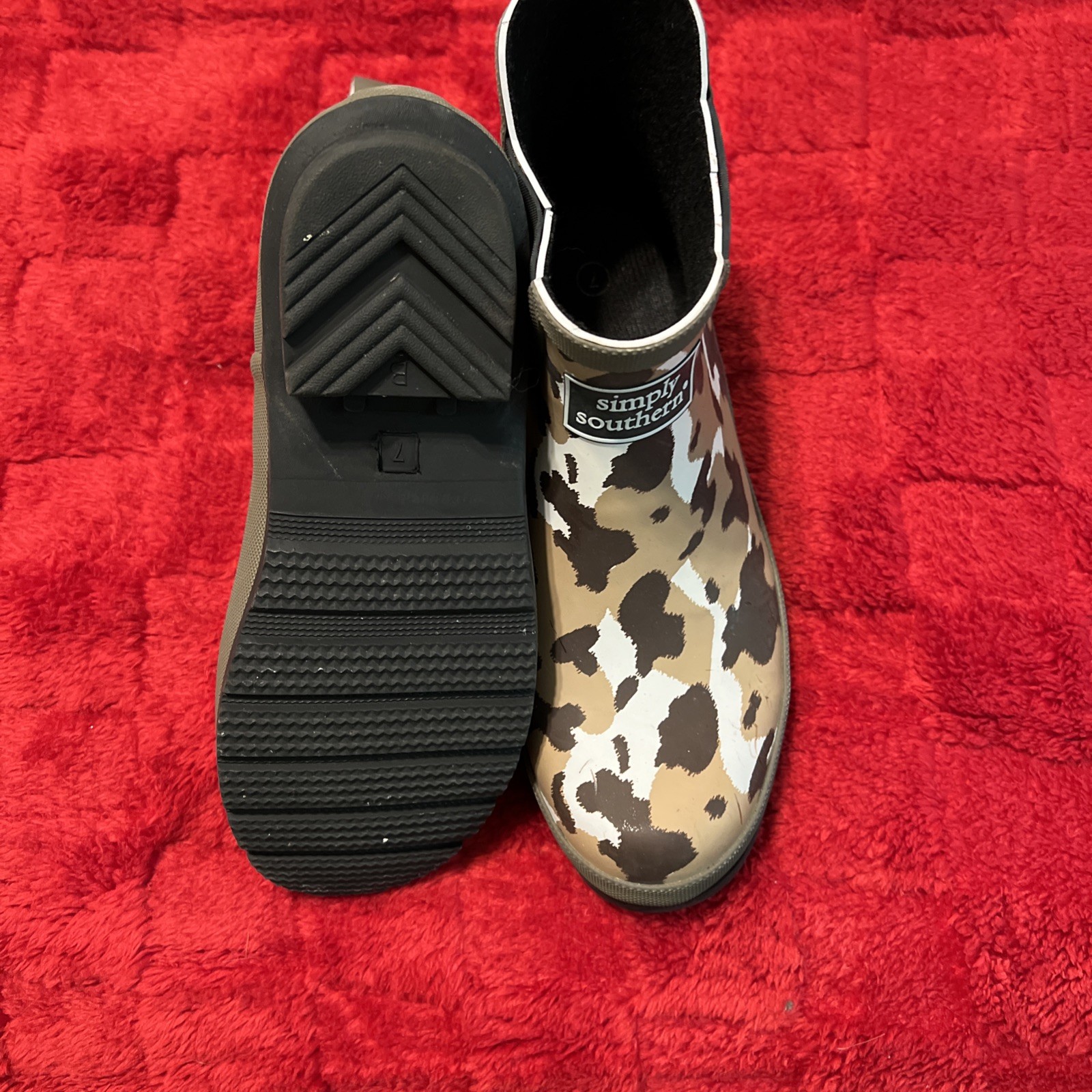 US Shoe Size:7Type:BootDepartment:WomenCustomized:NoPersonalize:NoCountry/Region of Manufacture:ChinaCalf Width:RegularOutsole Material:RubberPattern:CamouflageColor:BrownOccasion:CasualUpper Material:RubberBrand:Simply SouthernTheme:GardenVintage:NoSeason:Winter, FallStyle:Rain BootPlatform Height:1 in