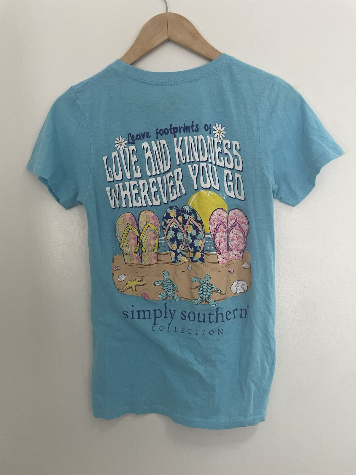 Simply Southern Women's Tropical Beach Cotton Blend Short Sleeve T-Shirt Blue S. Condition is pre-owned. Smoke free, pet free home. Shipped via USPS Ground Advantage. In good condition. There is pilling of the fabric. Free of rips or stains.