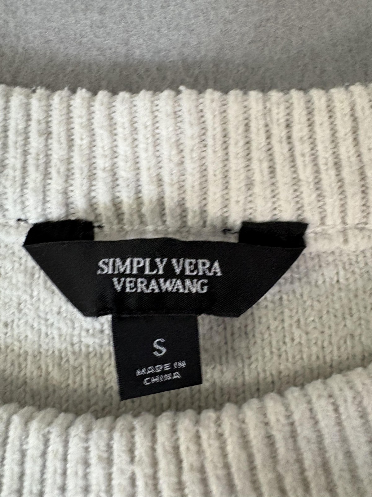 Brand: Simply Vera Vera Wang Item: Womens pullover sweater Tag size: Small (S) Color: Ivory/Cream Material: 95% Polyester (see care tag) Made in China RN: 73277 Design: Cable-knit pattern on front with raglan sleeves Features: Ribbed crewneck, cuffs, and hem; soft textured knit ideal for layering
